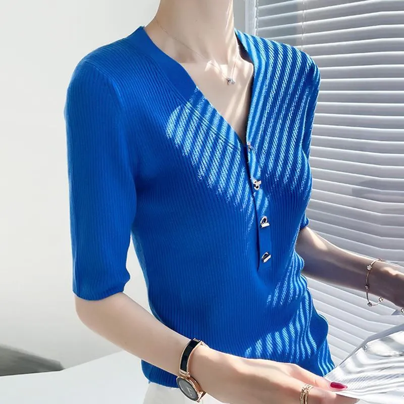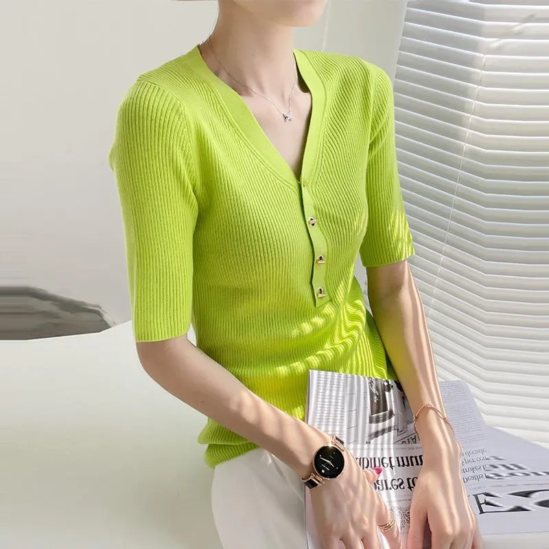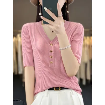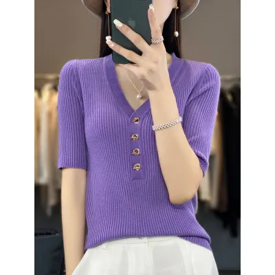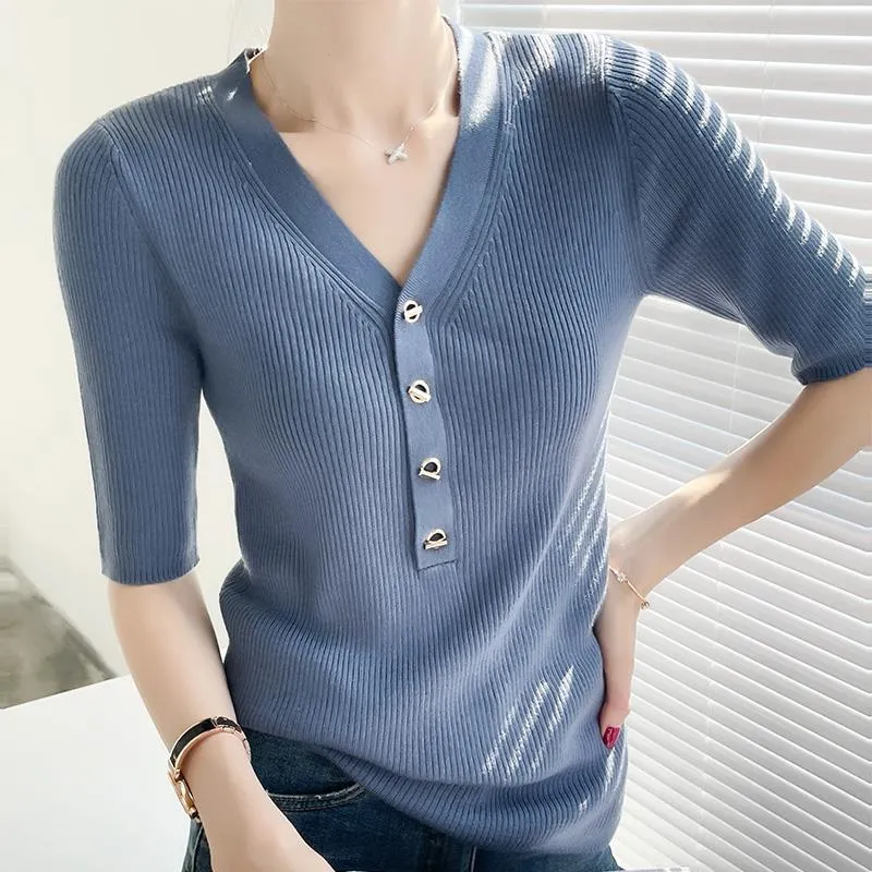 衣都精品- 2023新款V領金屬扣套頭針織五分袖上衣