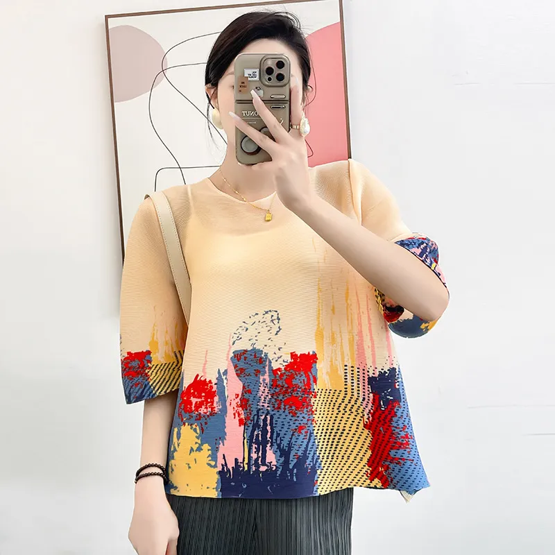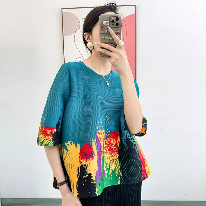 衣都精品- 2023新款時尚寬鬆大碼小眾圓領褶皺上衣