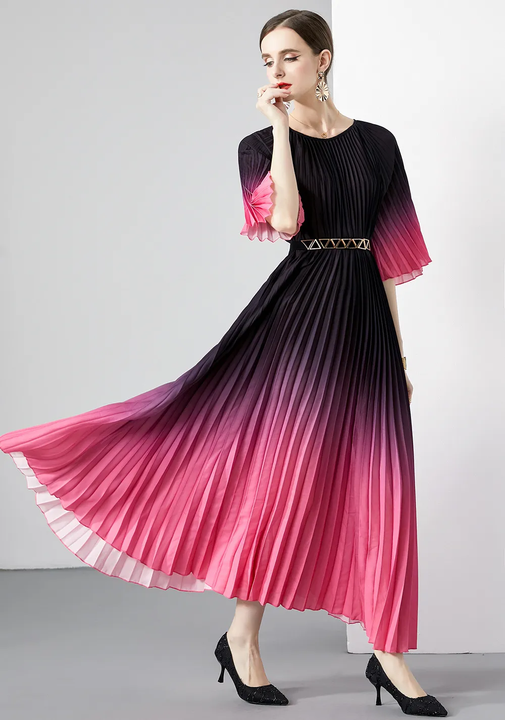 衣都精品- 2023新款時尚復古漸變色百褶大擺連衣裙