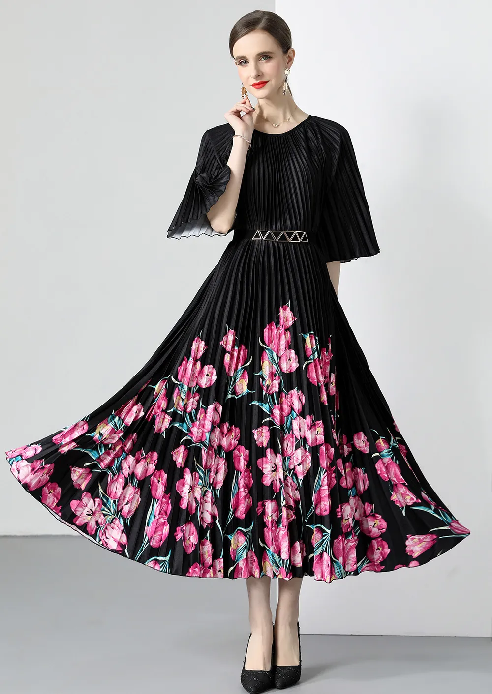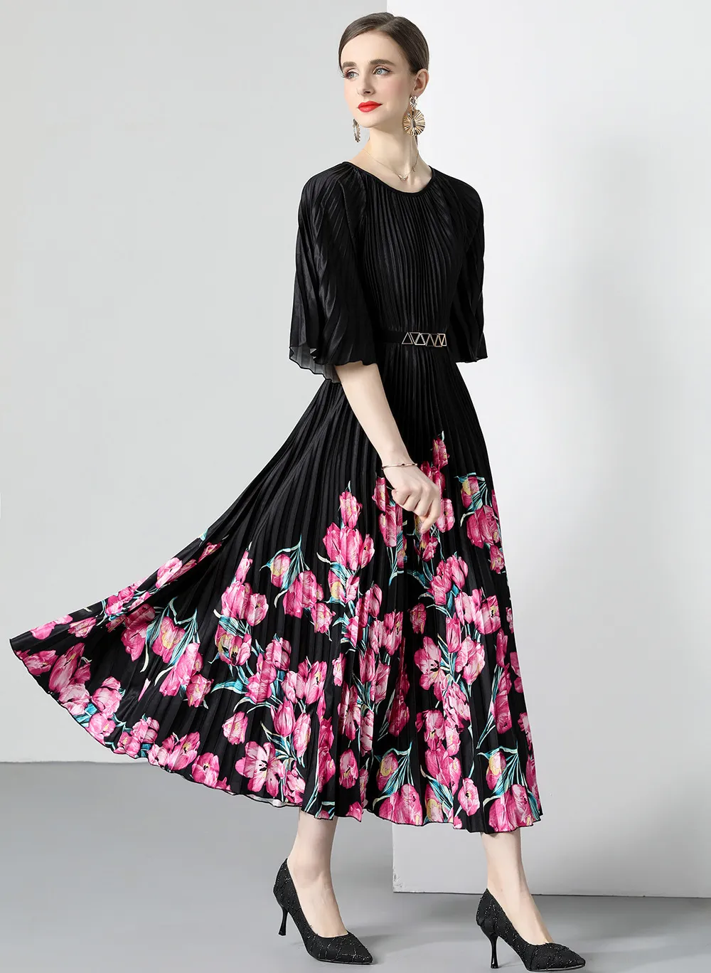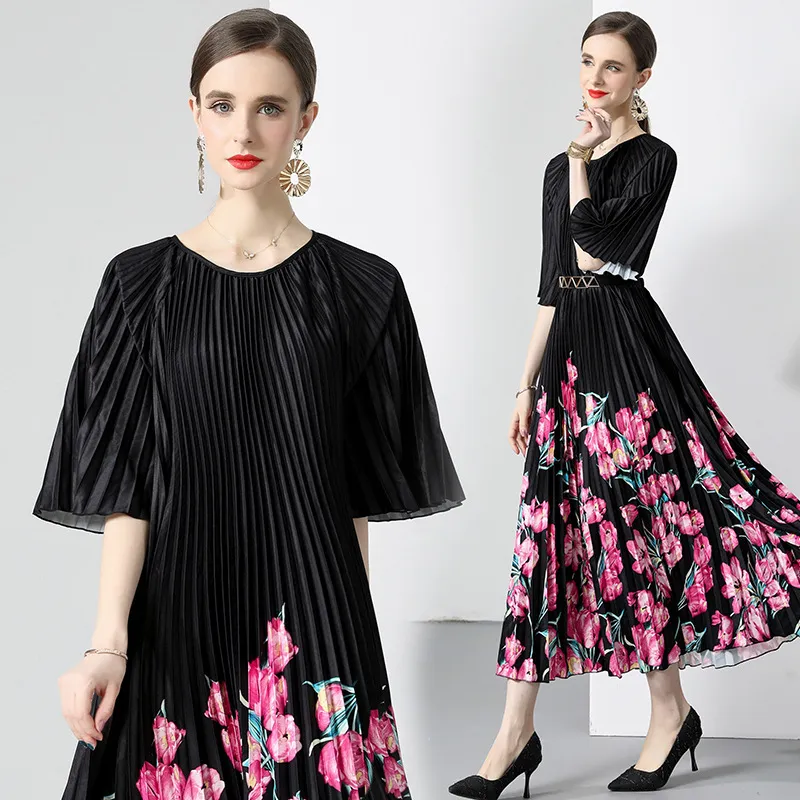 衣都精品- 2023新款時尚復古印花百褶大擺連衣裙