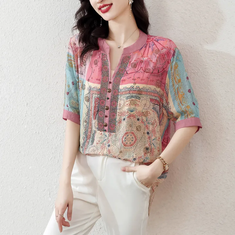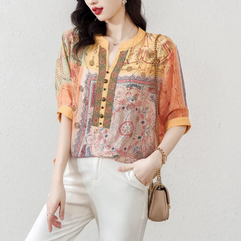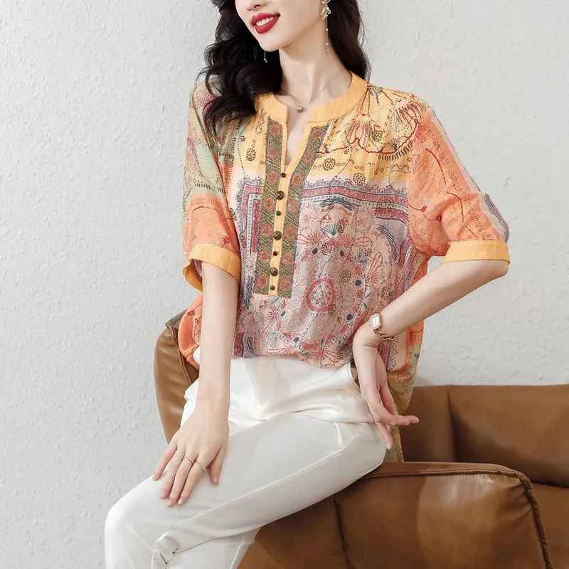 衣都精品- 2023新款圓領輕薄印花彩色條紋上衣