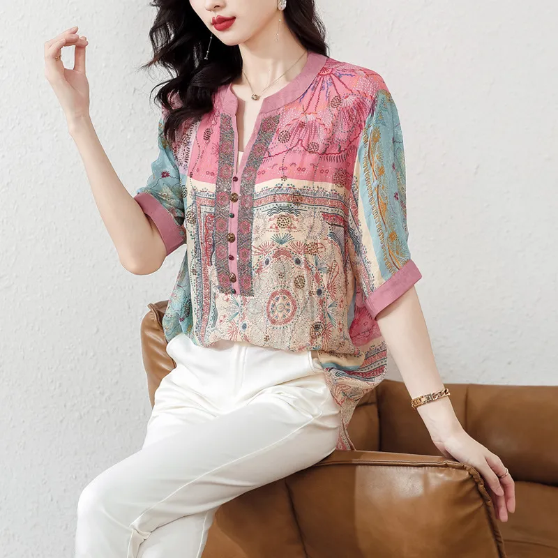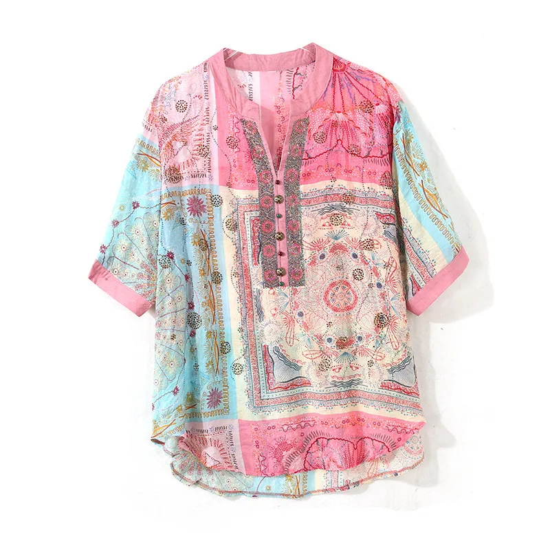 衣都精品- 2023新款無袖V領棉麻印花背心上衣