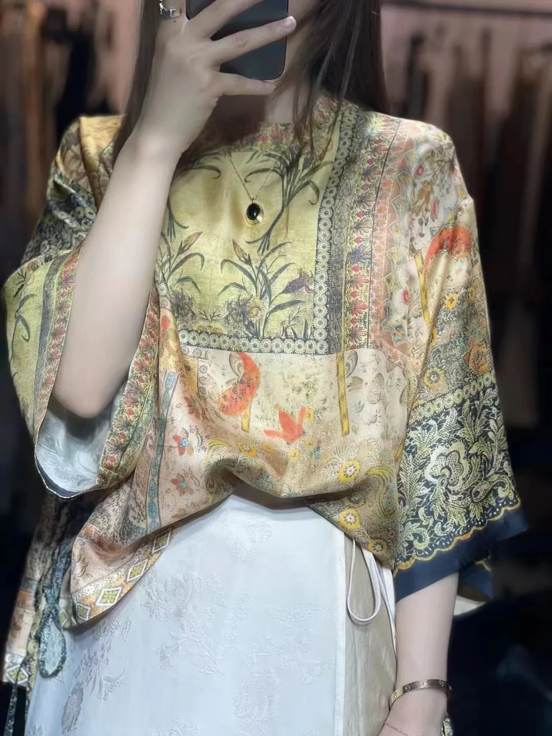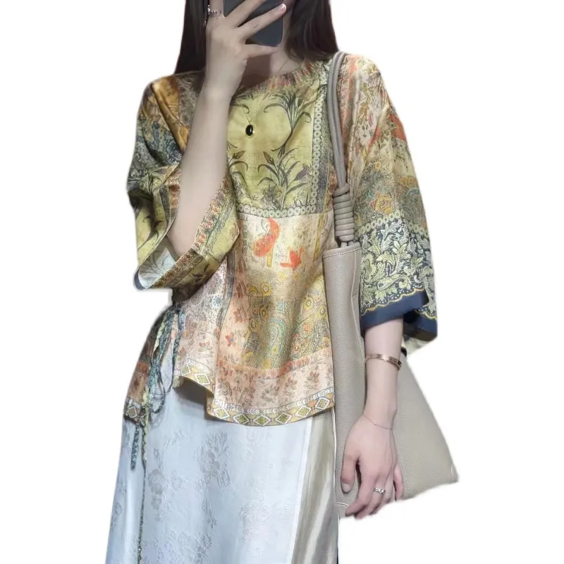 衣都精品- 2023新款重磅斜紋印花圓領寬鬆繫帶上衣