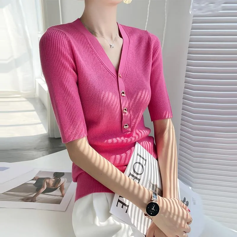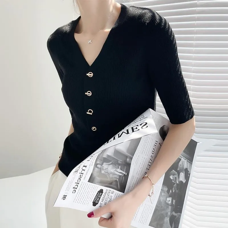 衣都精品- 2023新款百搭V領金屬扣套頭五分袖上衣