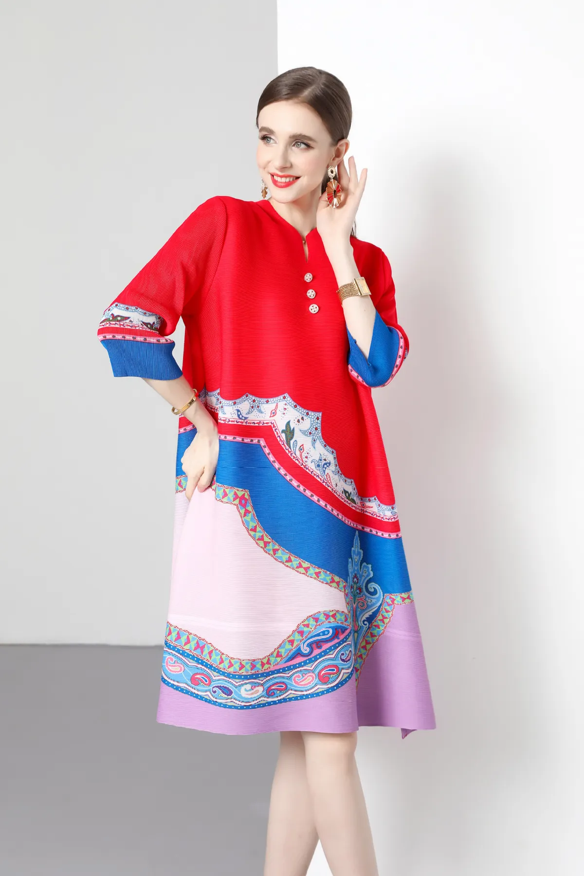 衣都精品- 2023新款清新配色印花繫帶氣質連衣裙