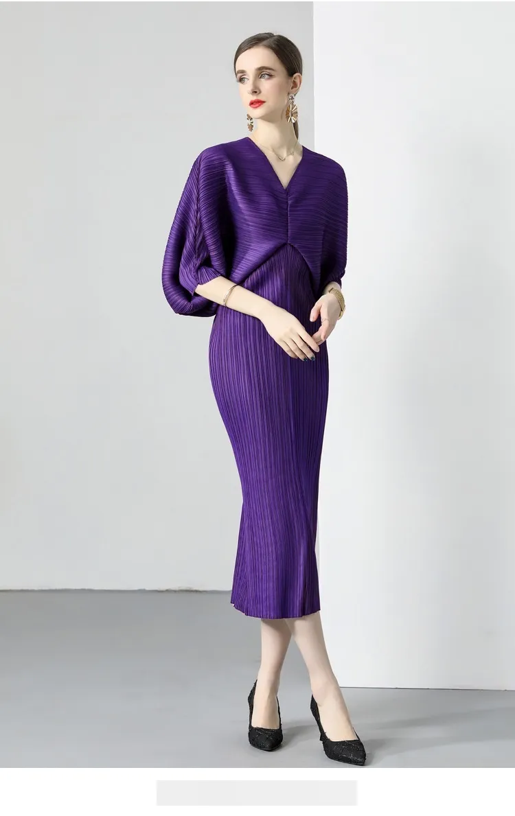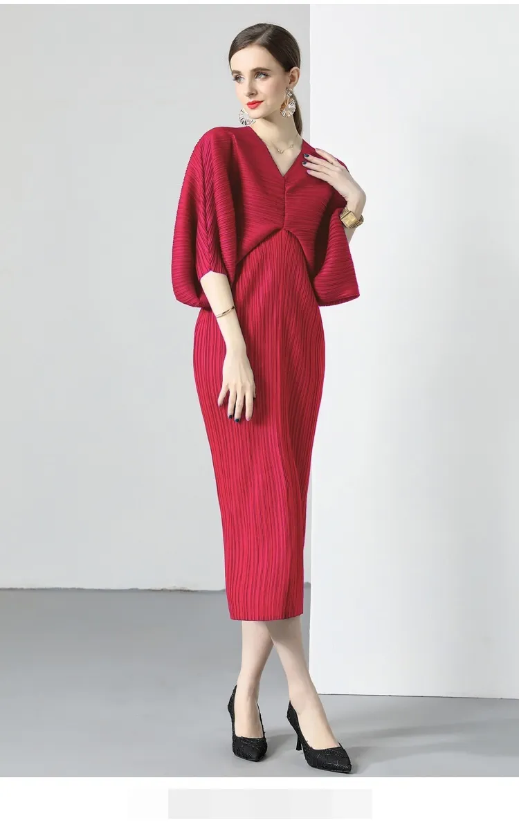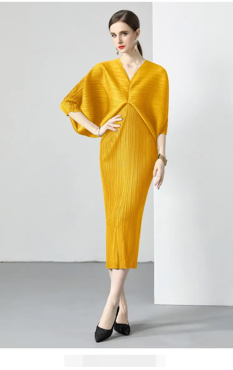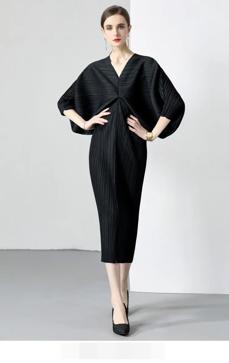 衣都精品- 2023新款時尚復古V領五分袖皺褶連衣裙