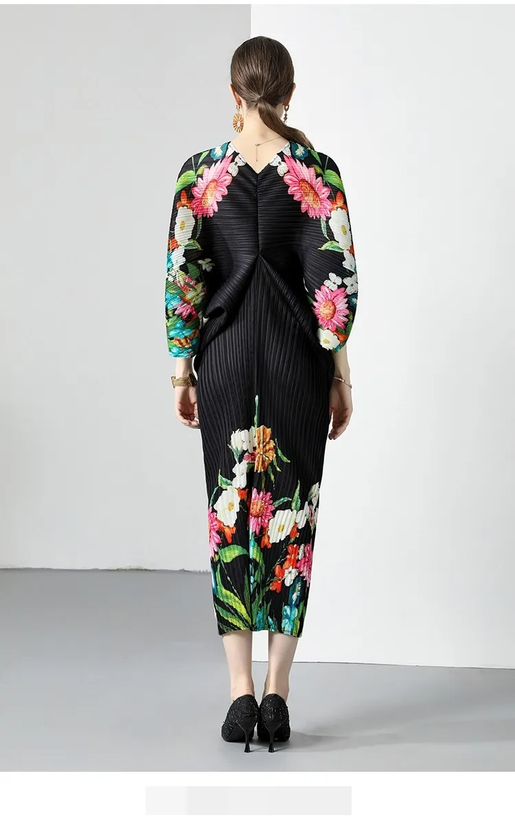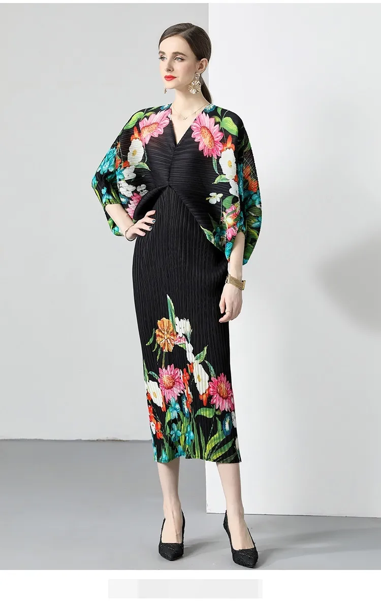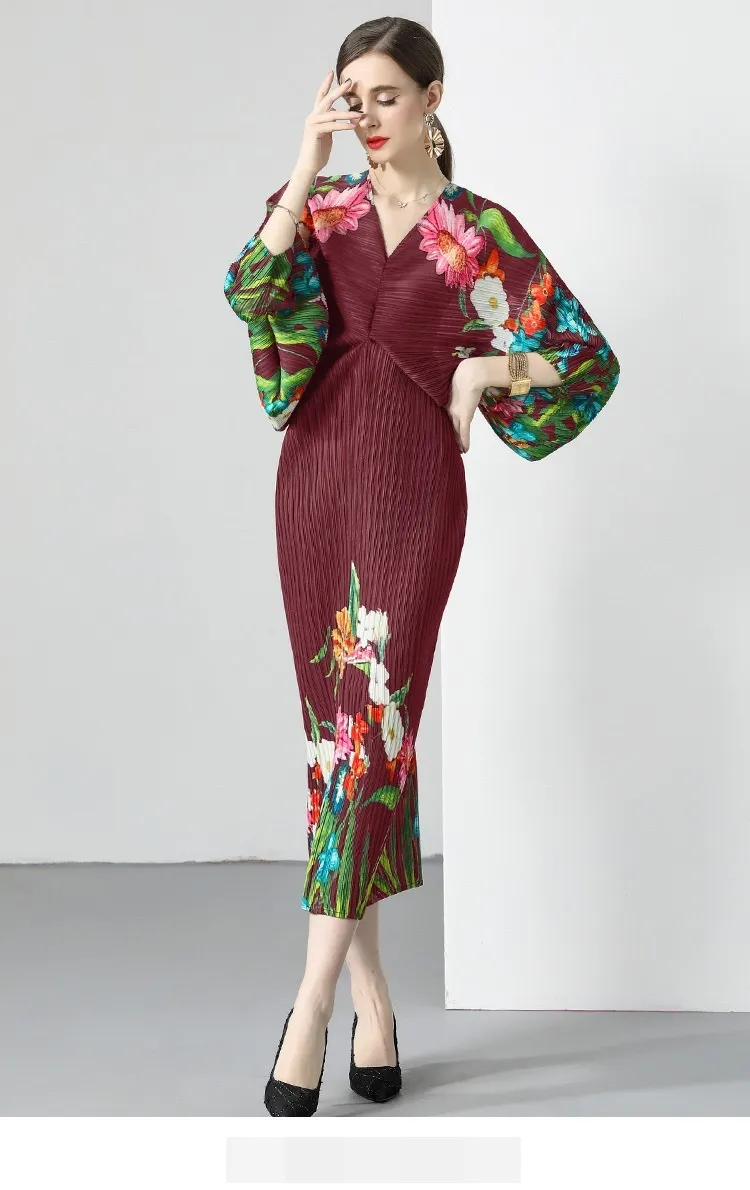 衣都精品- 2023新款復古V領五分袖皺褶印花連衣裙