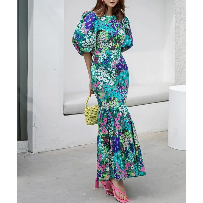 衣都精品- 2023新款時尚碎花小雛菊修身圓領魚尾連衣裙
