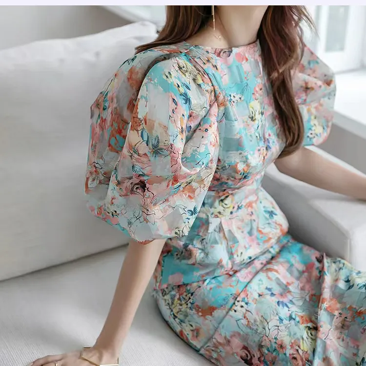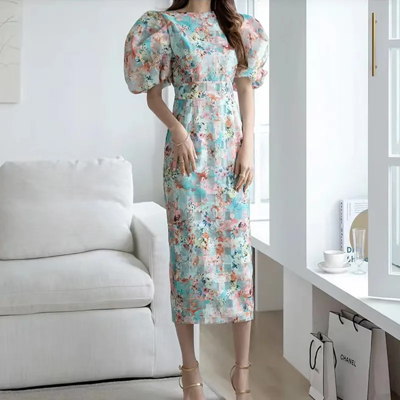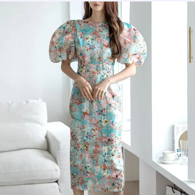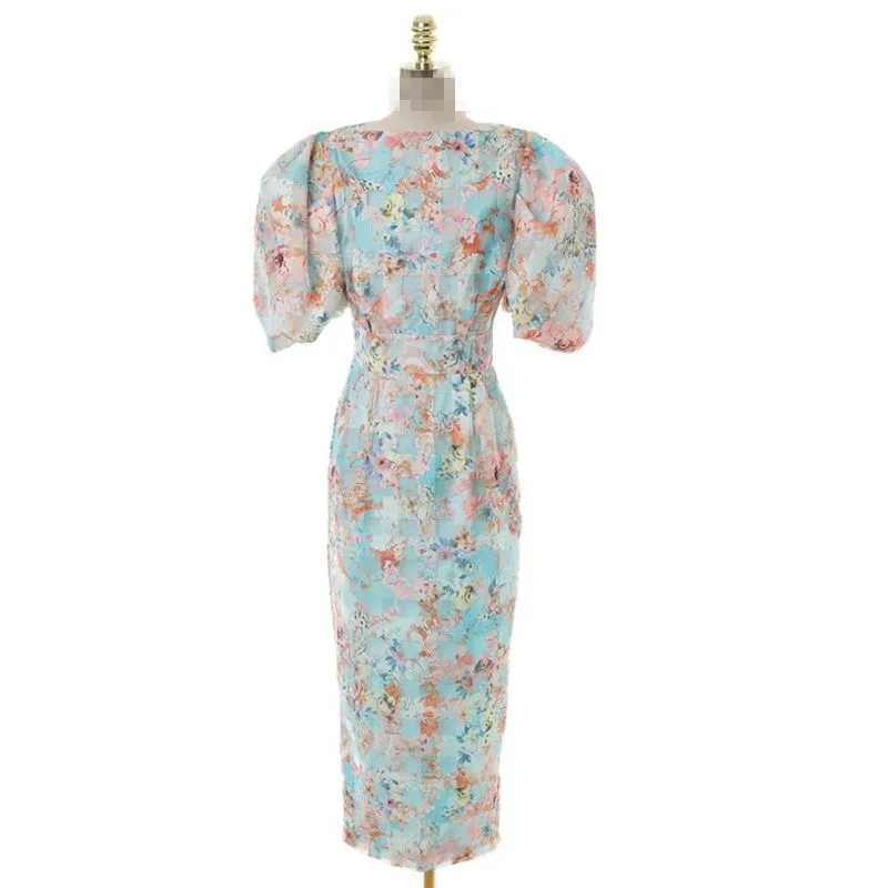 衣都精品- 2023新款氣質水彩印花修身泡泡袖連衣裙
