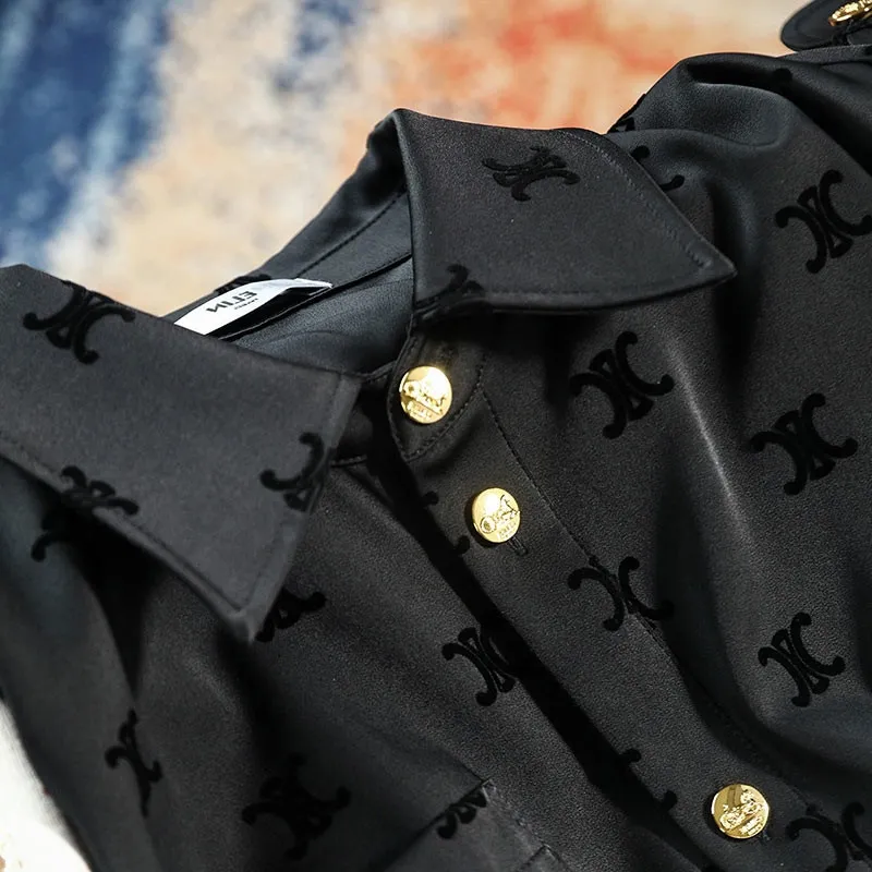 衣都精品- 2023新款重磅斜紋真絲印花圓領寬鬆繫帶上衣