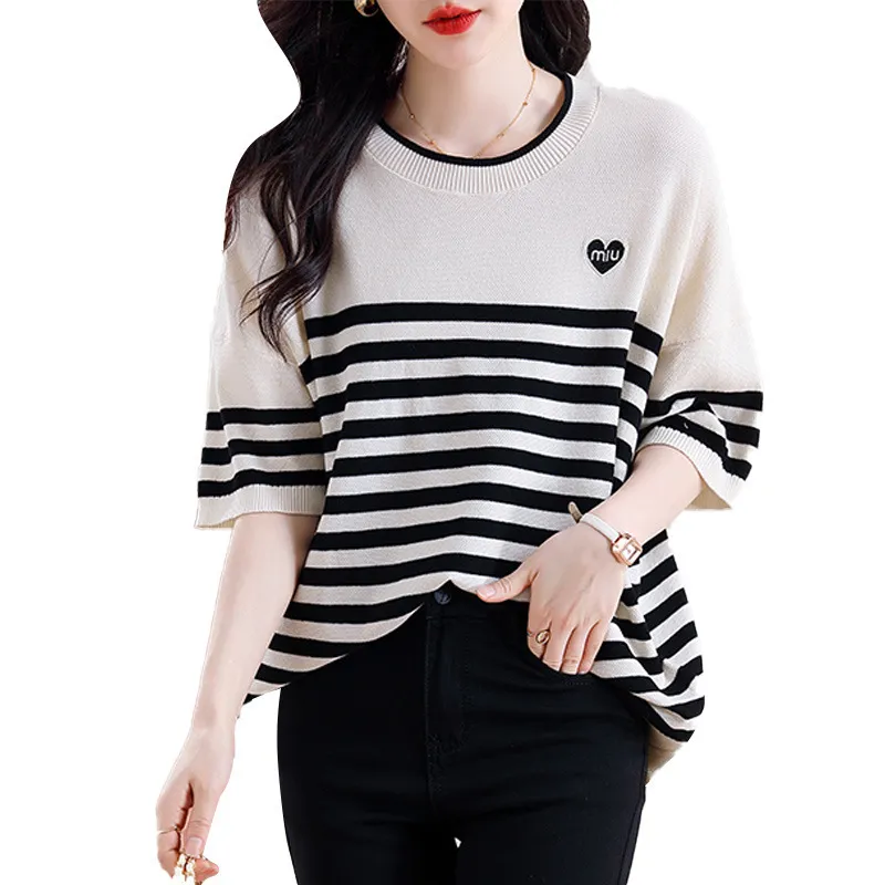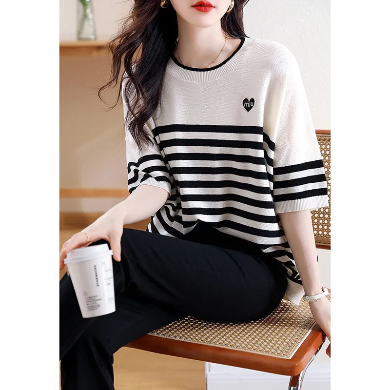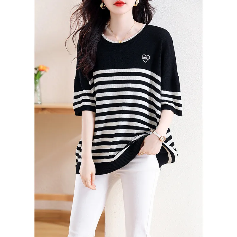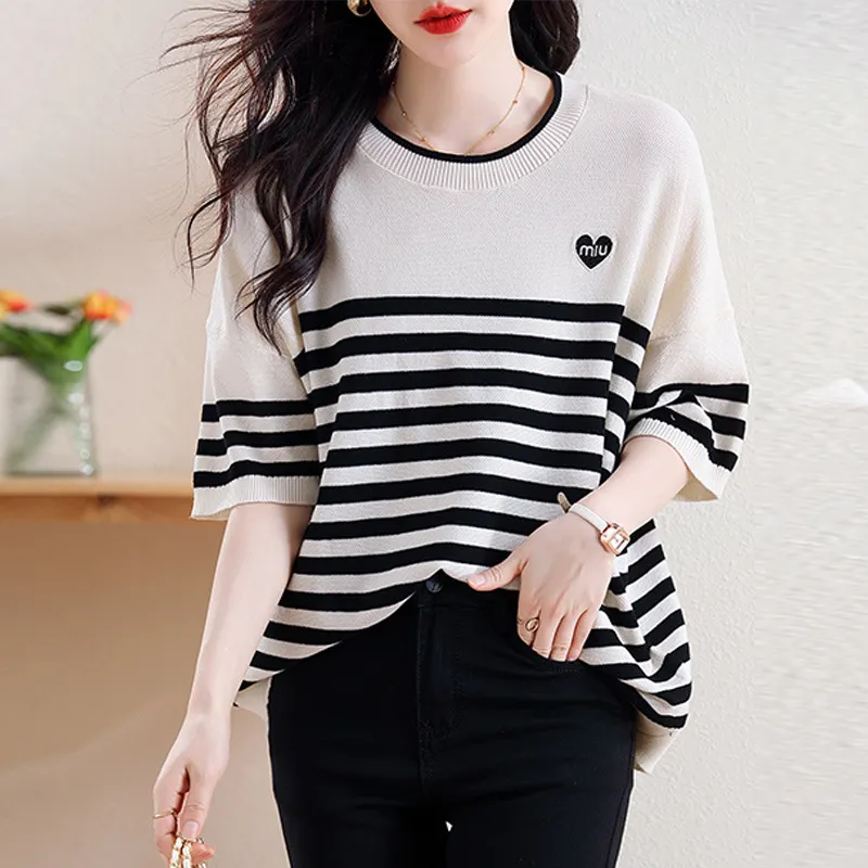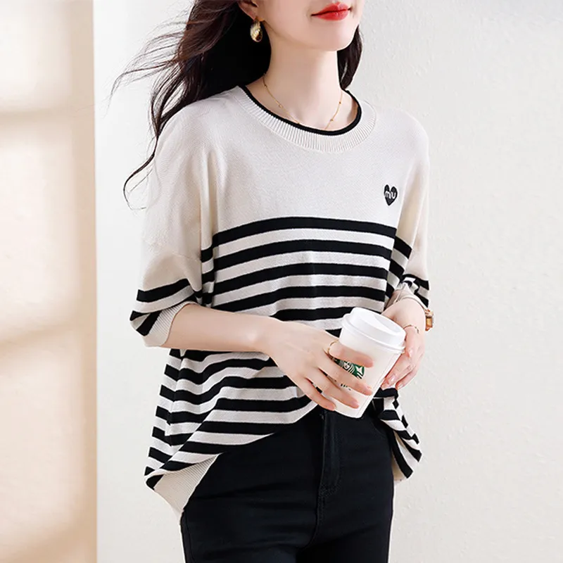 衣都精品- 2023新款寬鬆條紋拼接中袖薄針織上衣