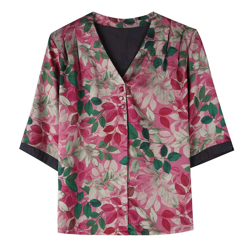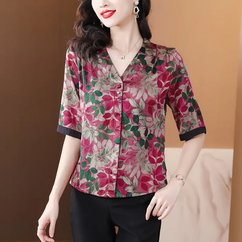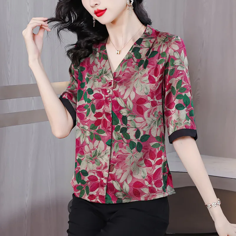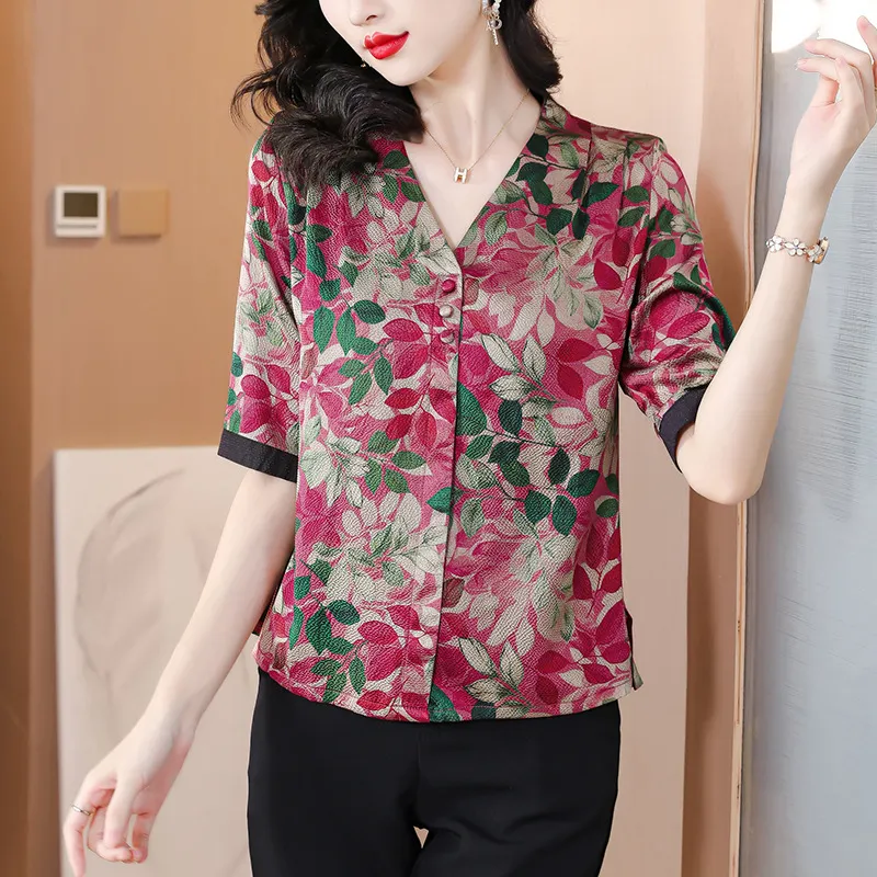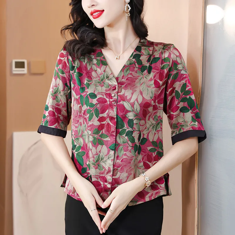 衣都精品- 2023新款時尚復古印花絲質顯瘦V領上衣