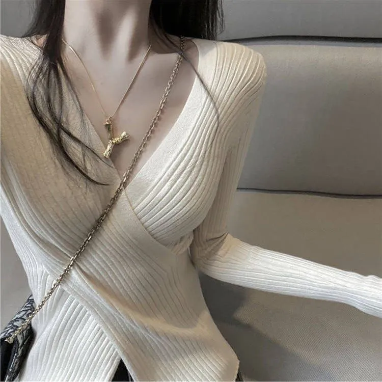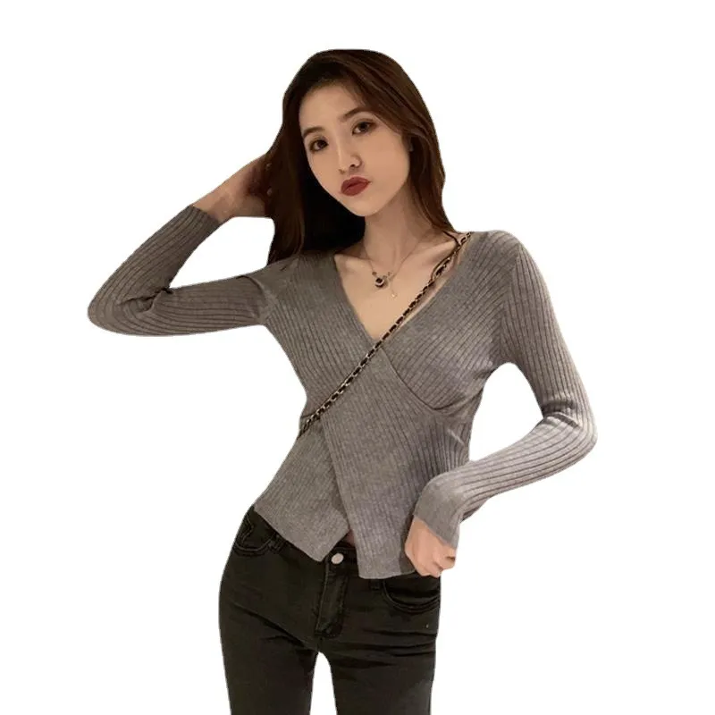 衣都精品- 2023新款時尚性感交叉V領修身針織衫