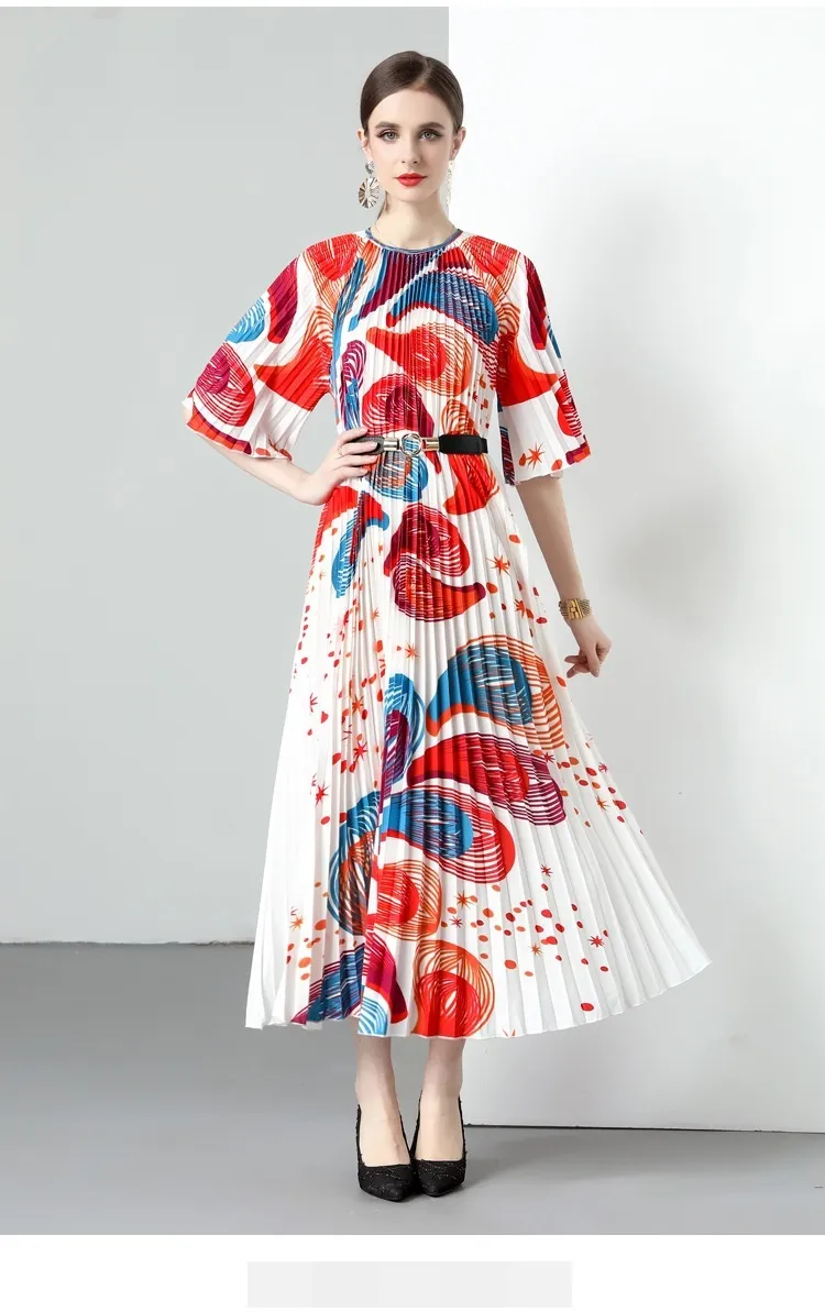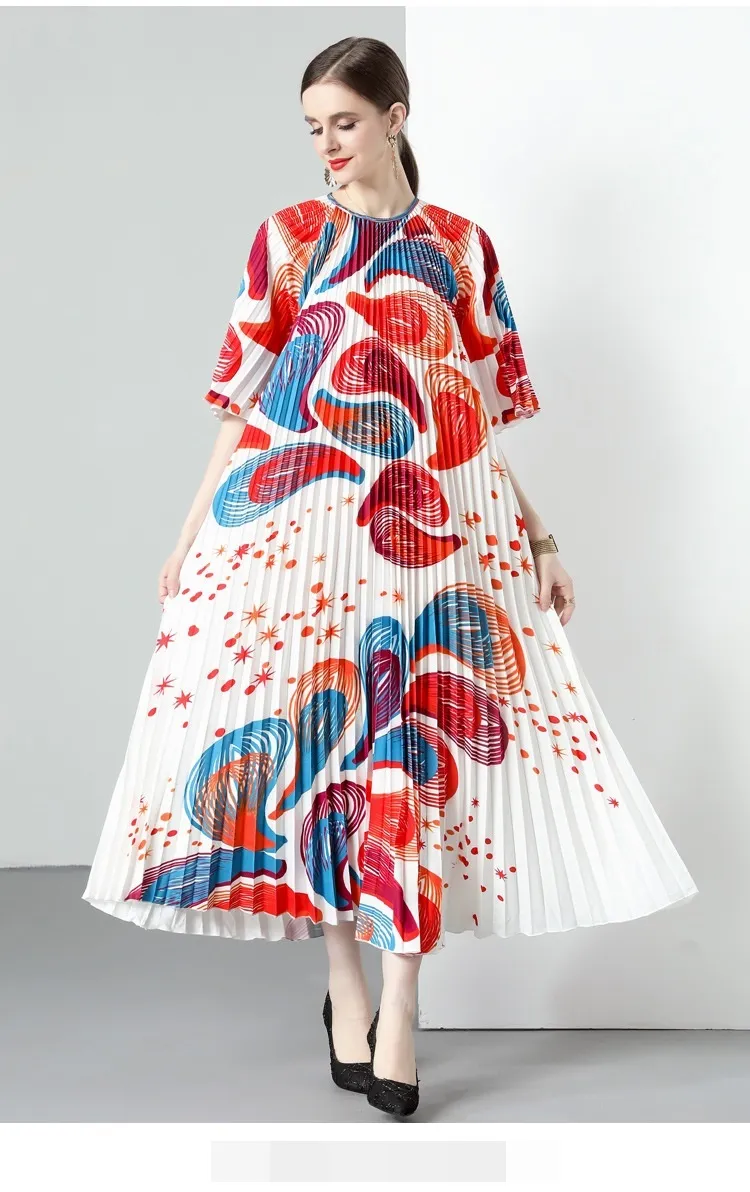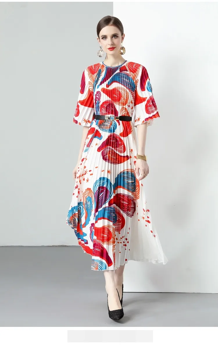 衣都精品- 2023新款時尚復古印花百褶大擺連衣裙