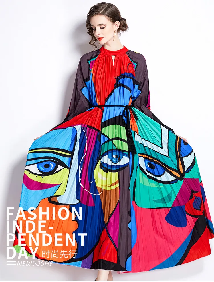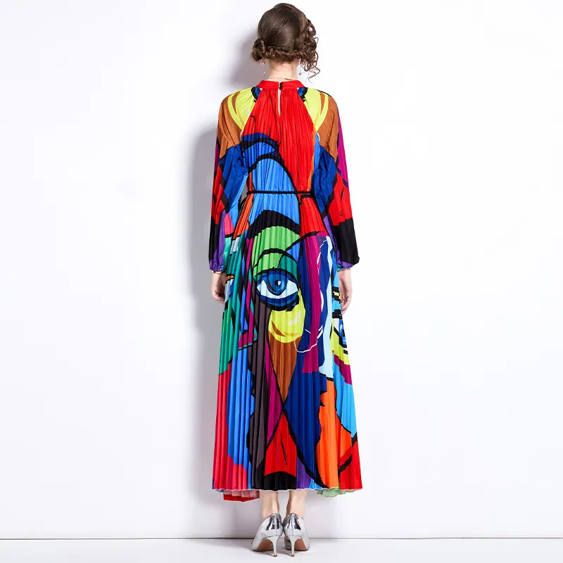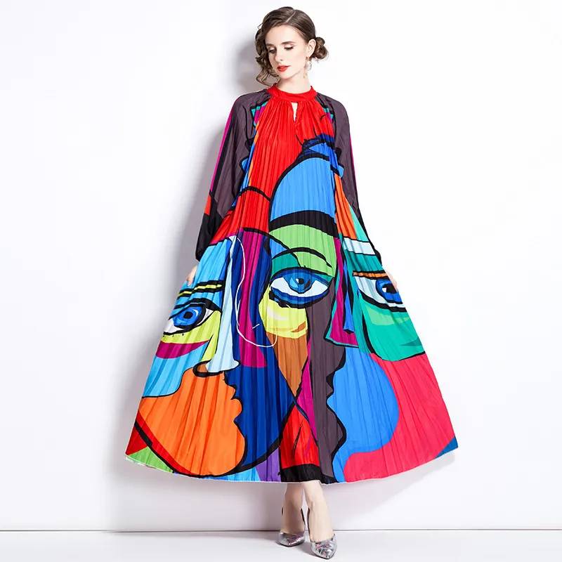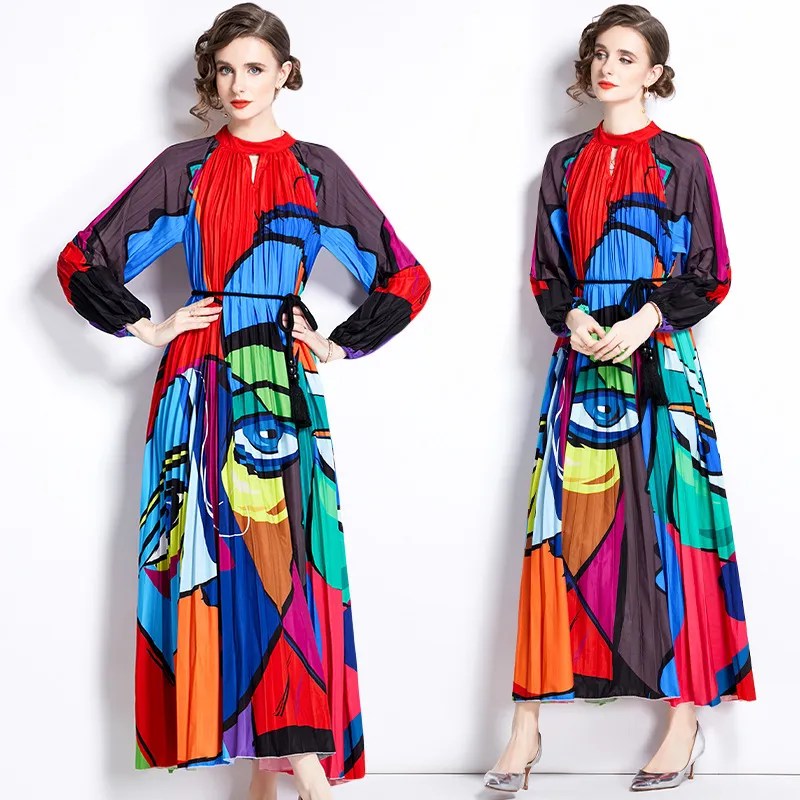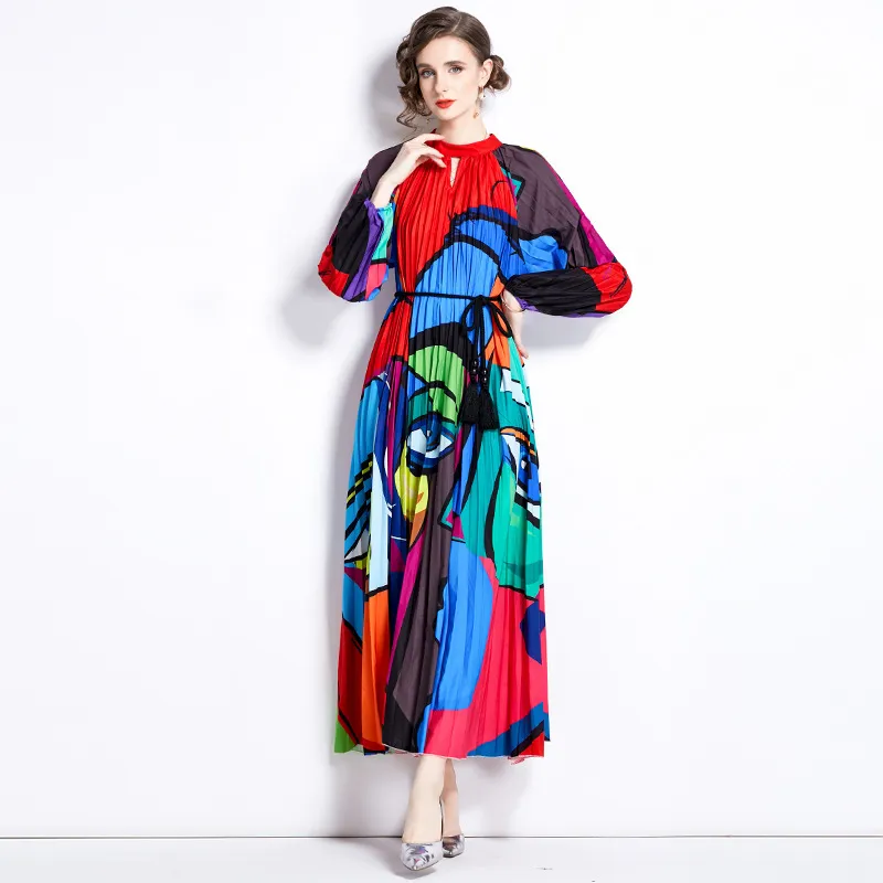 衣都精品- 2023新款時尚復古印花百褶大擺連衣裙