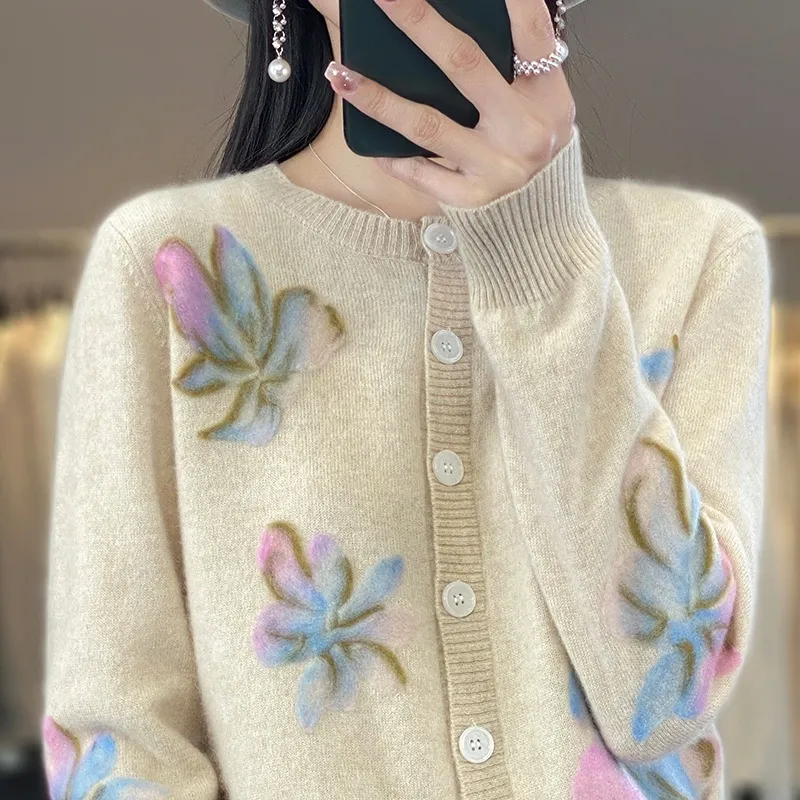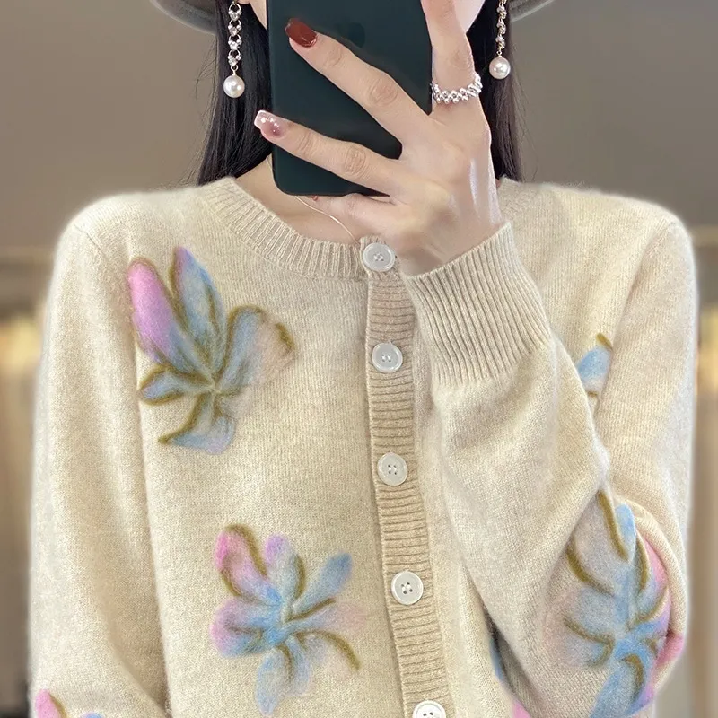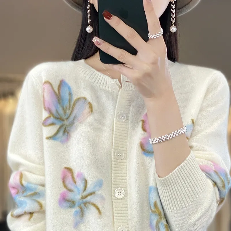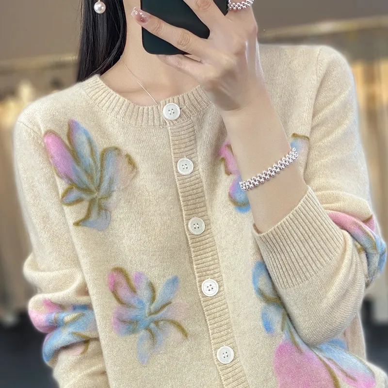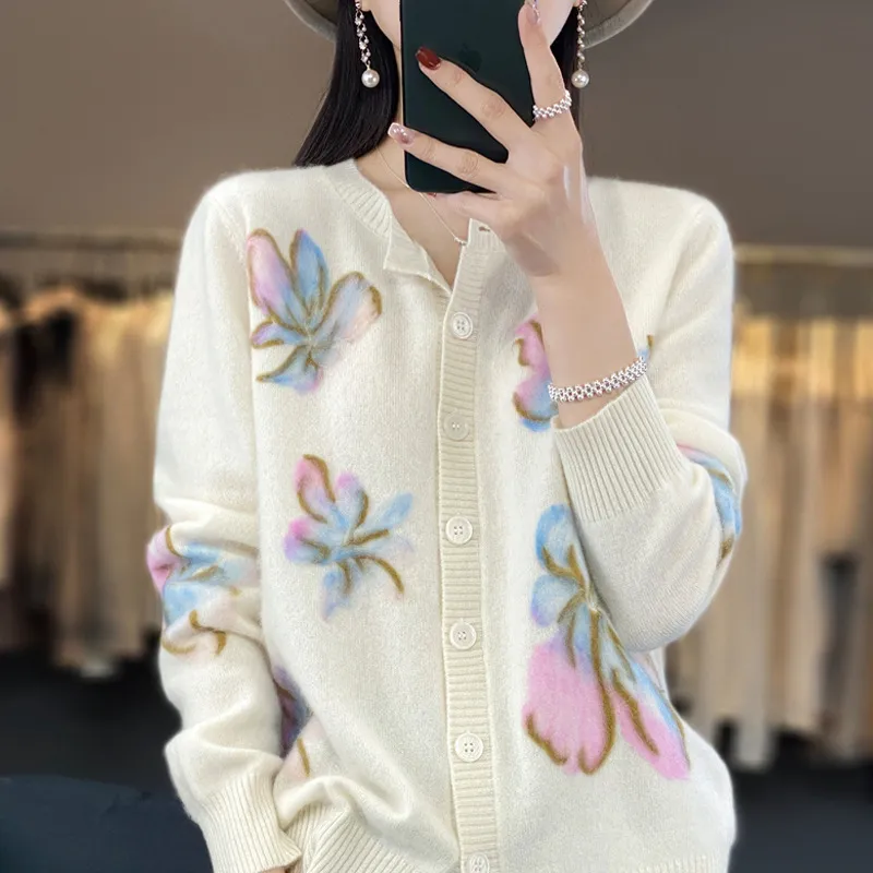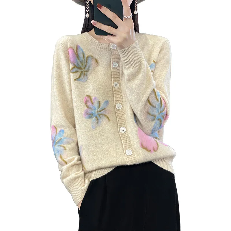衣都精品- 2023新款羊絨開襟圓領提花拼色外套