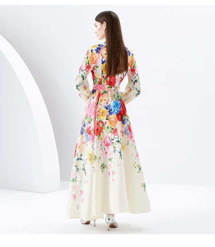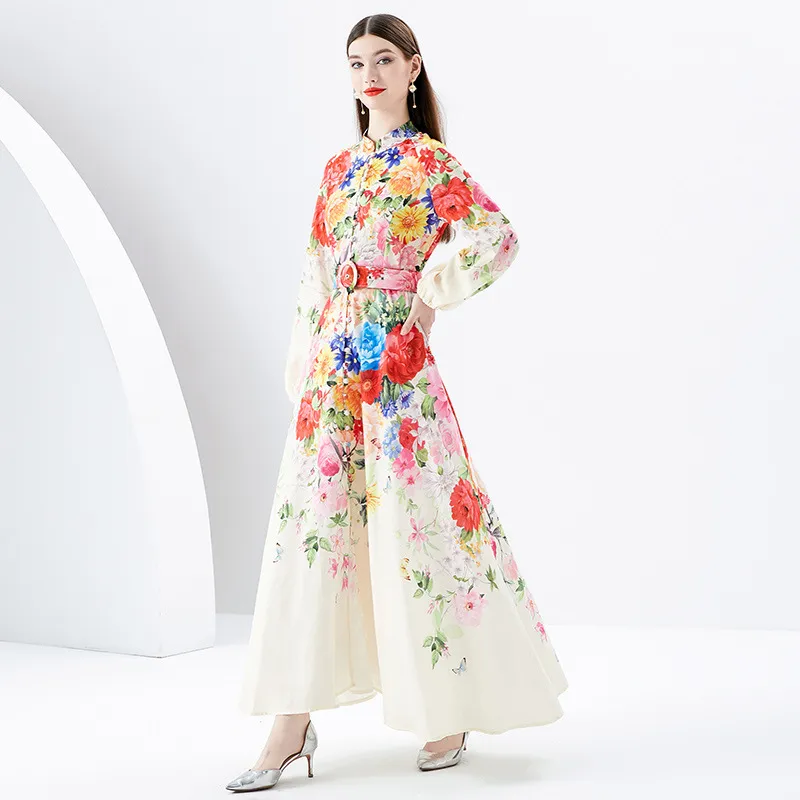 衣都精品- 2023新款復古度假風立領燈籠袖大擺連衣裙