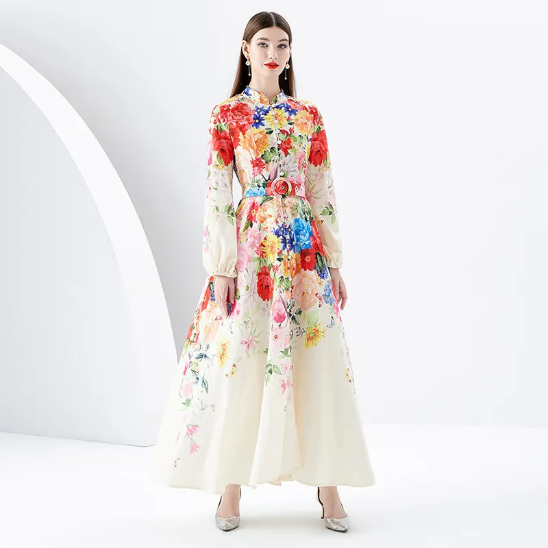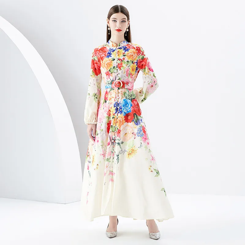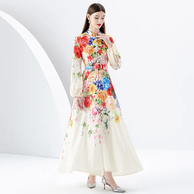 衣都精品- 2023新款民族風復古立領燈籠袖印花連衣裙