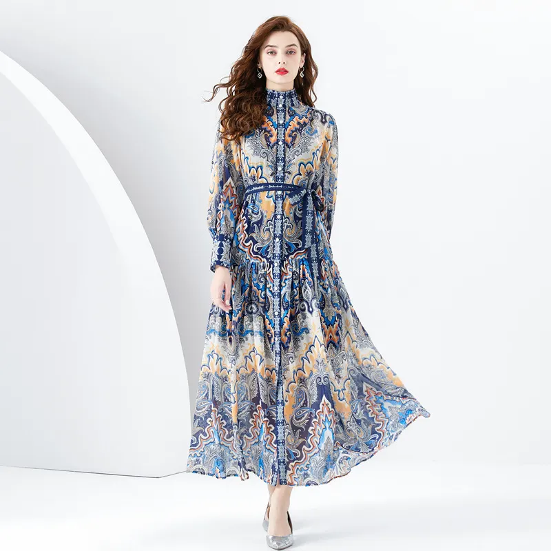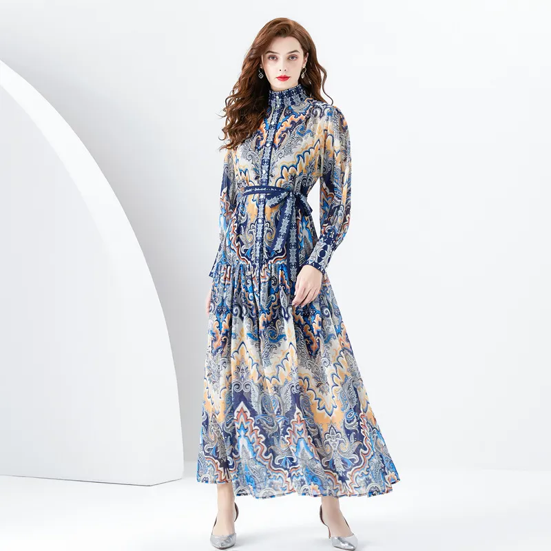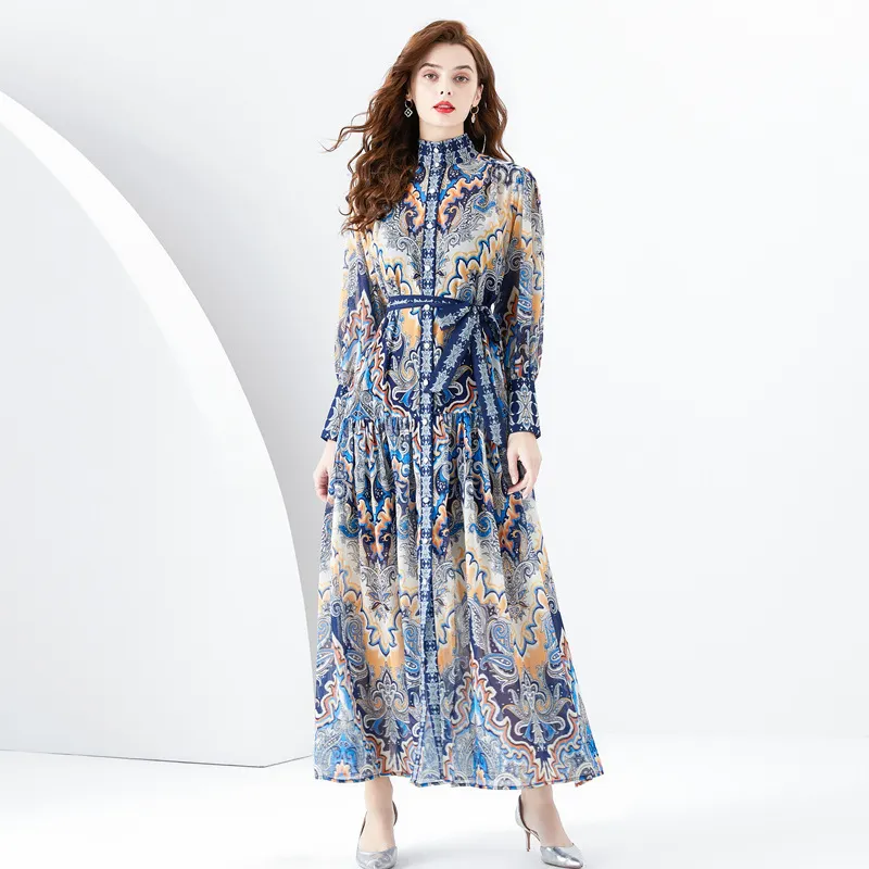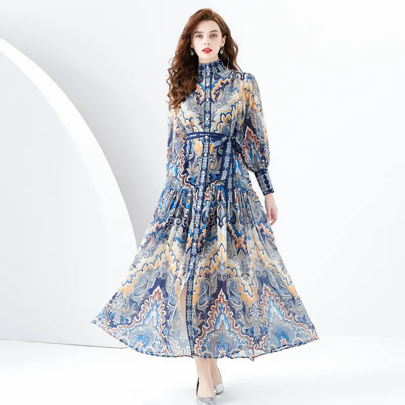 衣都精品- 2023新款度假風印花立領長袖大擺連衣裙
