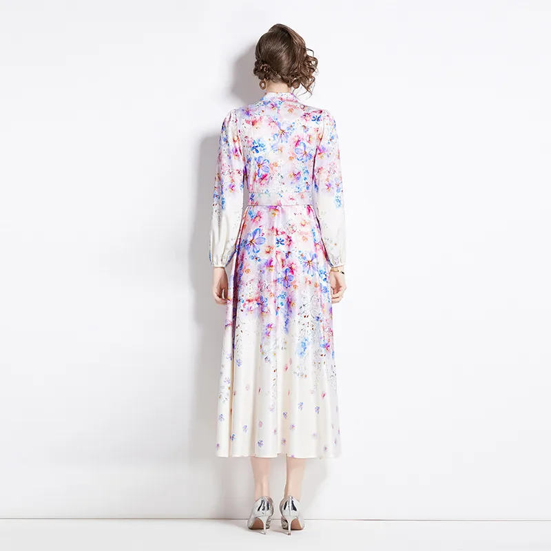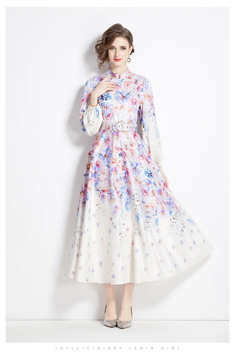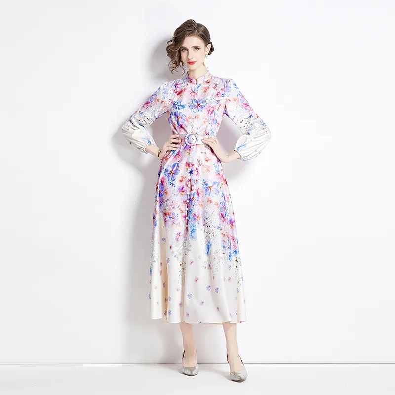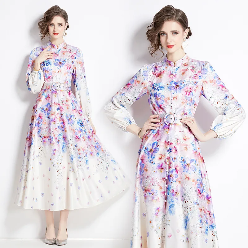 衣都精品- 2023新款度假風印花立領長袖大擺連衣裙