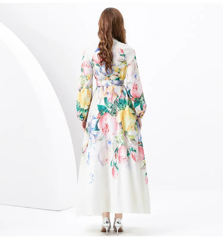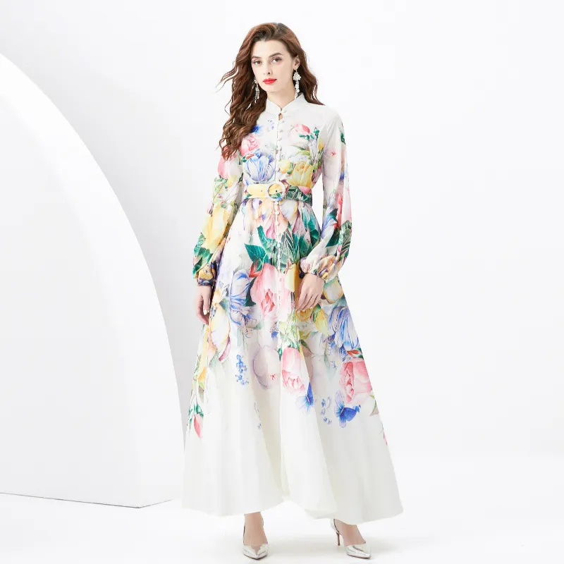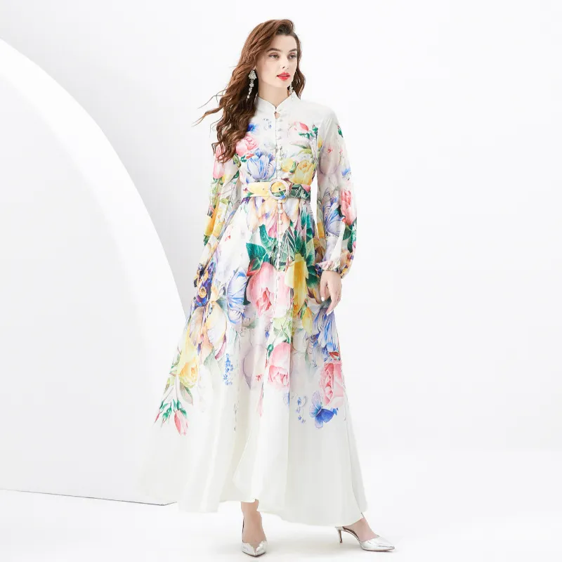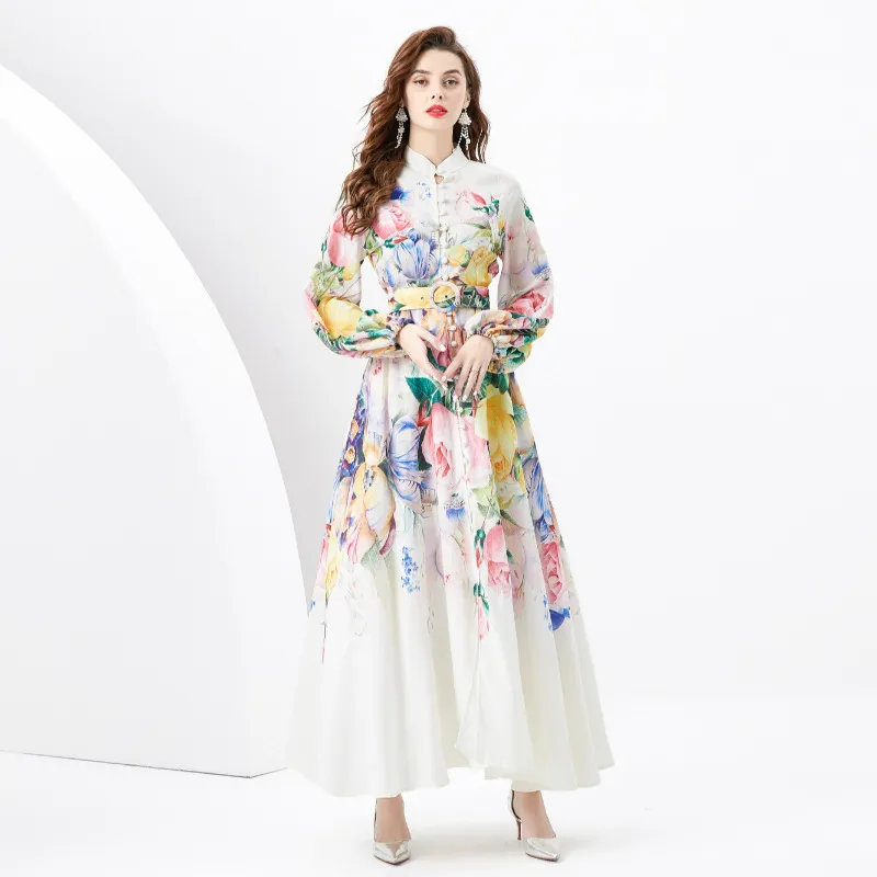 衣都精品- 2023新款時尚度假風立領燈籠袖印花連衣裙