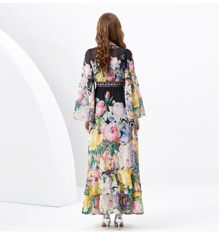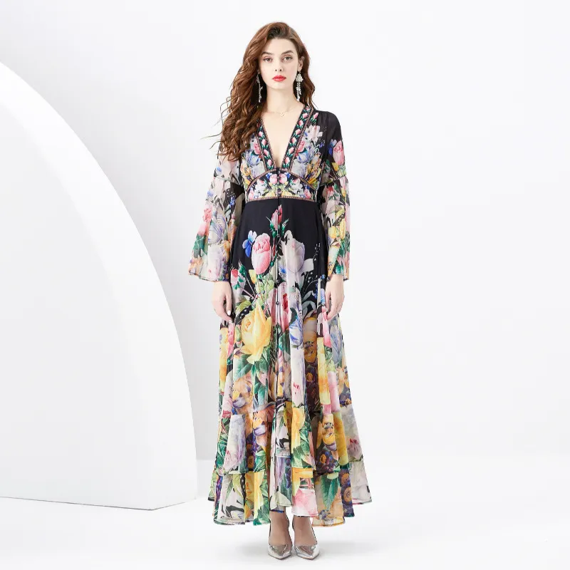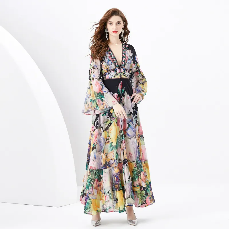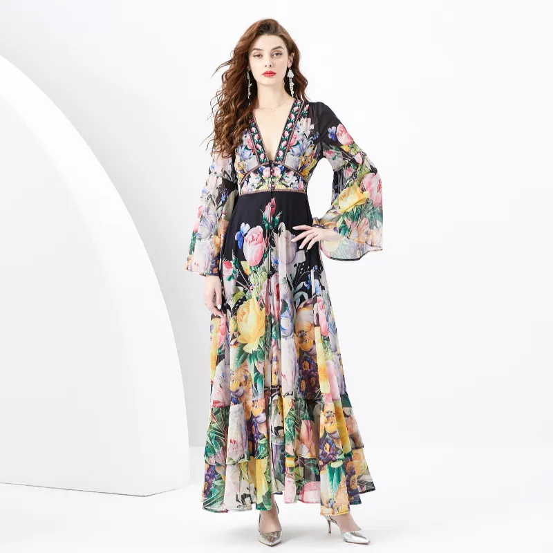 衣都精品- 2023新款宮廷風深V領喇叭袖大擺復古連衣裙