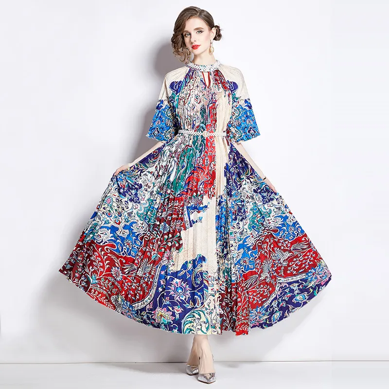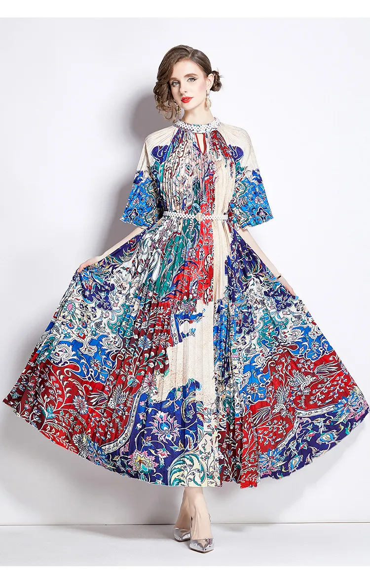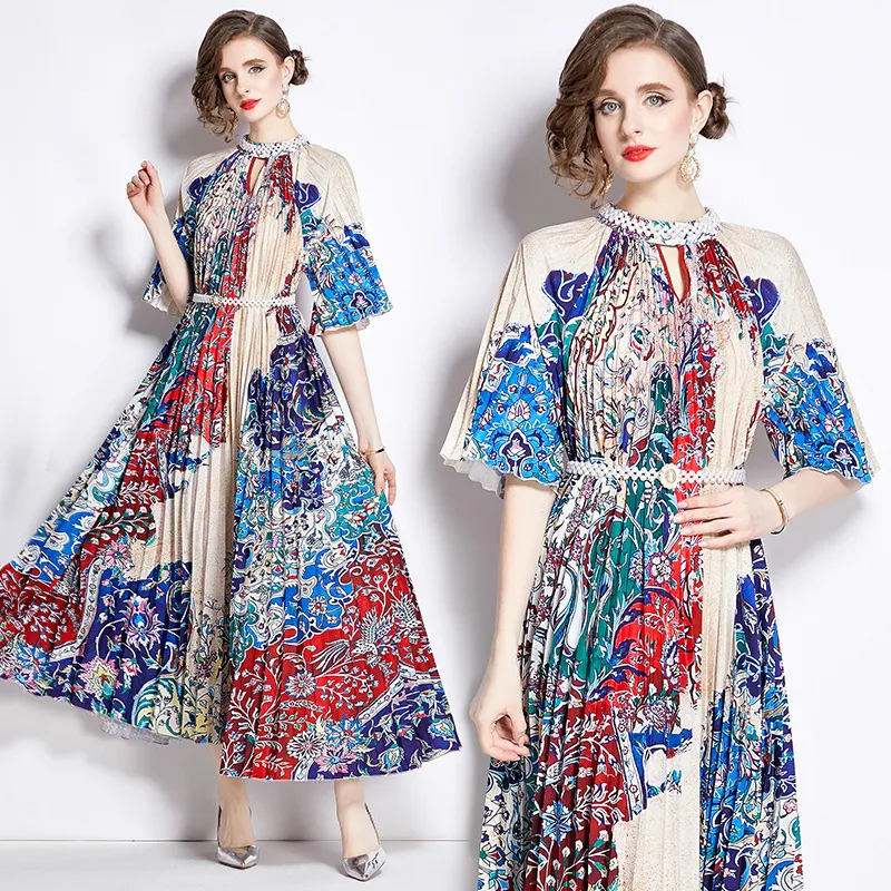 衣都精品- 2023新款氣質時尚復古釘珠印花百褶大擺連衣裙