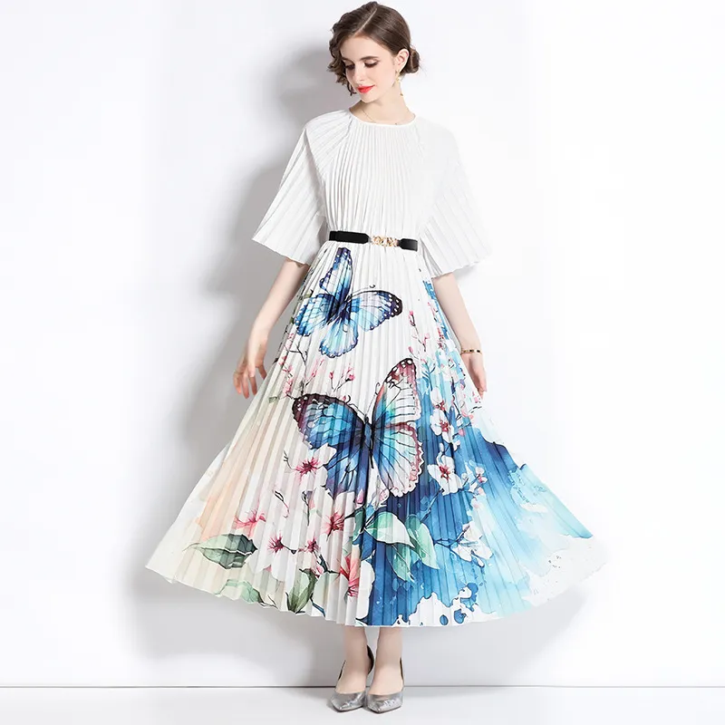 衣都精品- 2023新款氣質時尚復古印花百褶大擺連衣裙