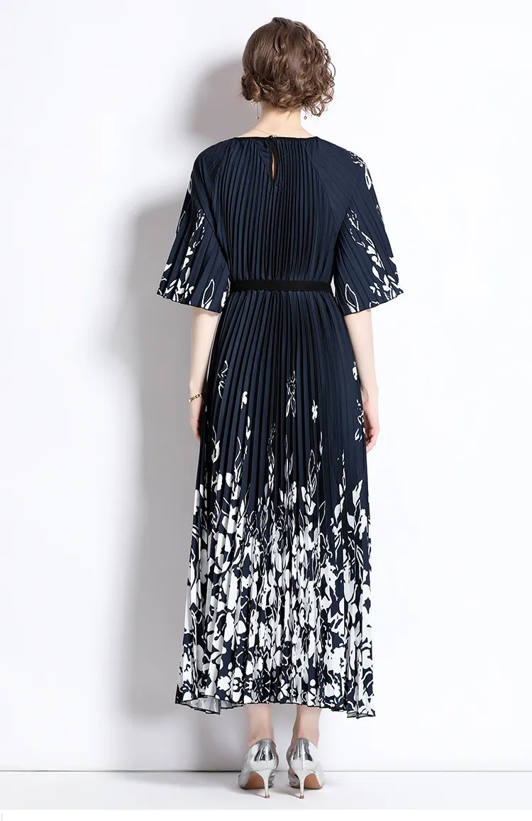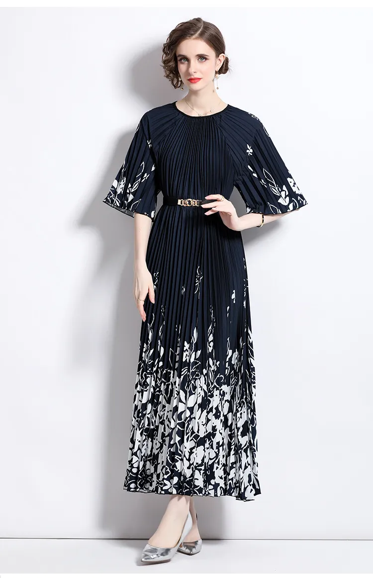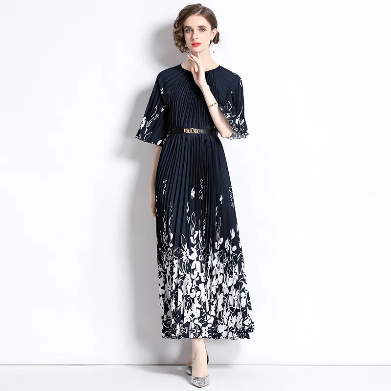 衣都精品- 2023新款氣質時尚復古印花百褶大擺連衣裙