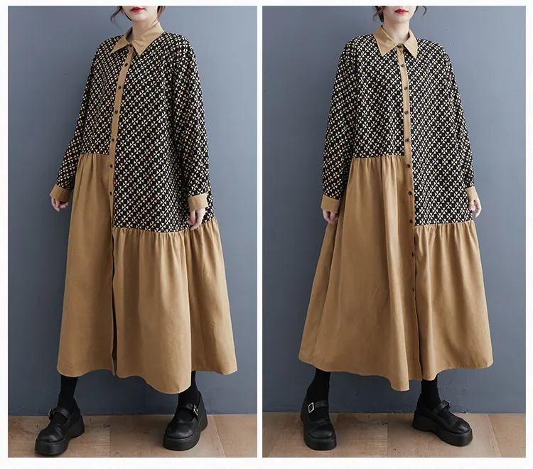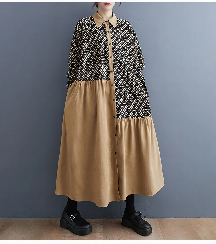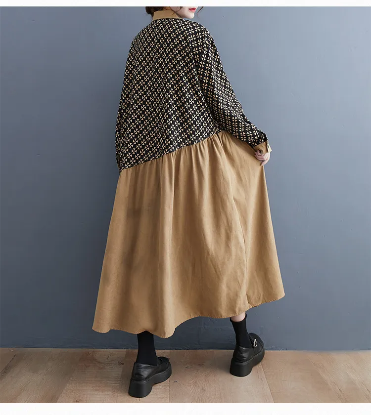 衣都精品- 新款韓版寬鬆大碼印花拼接文藝長袖連衣裙