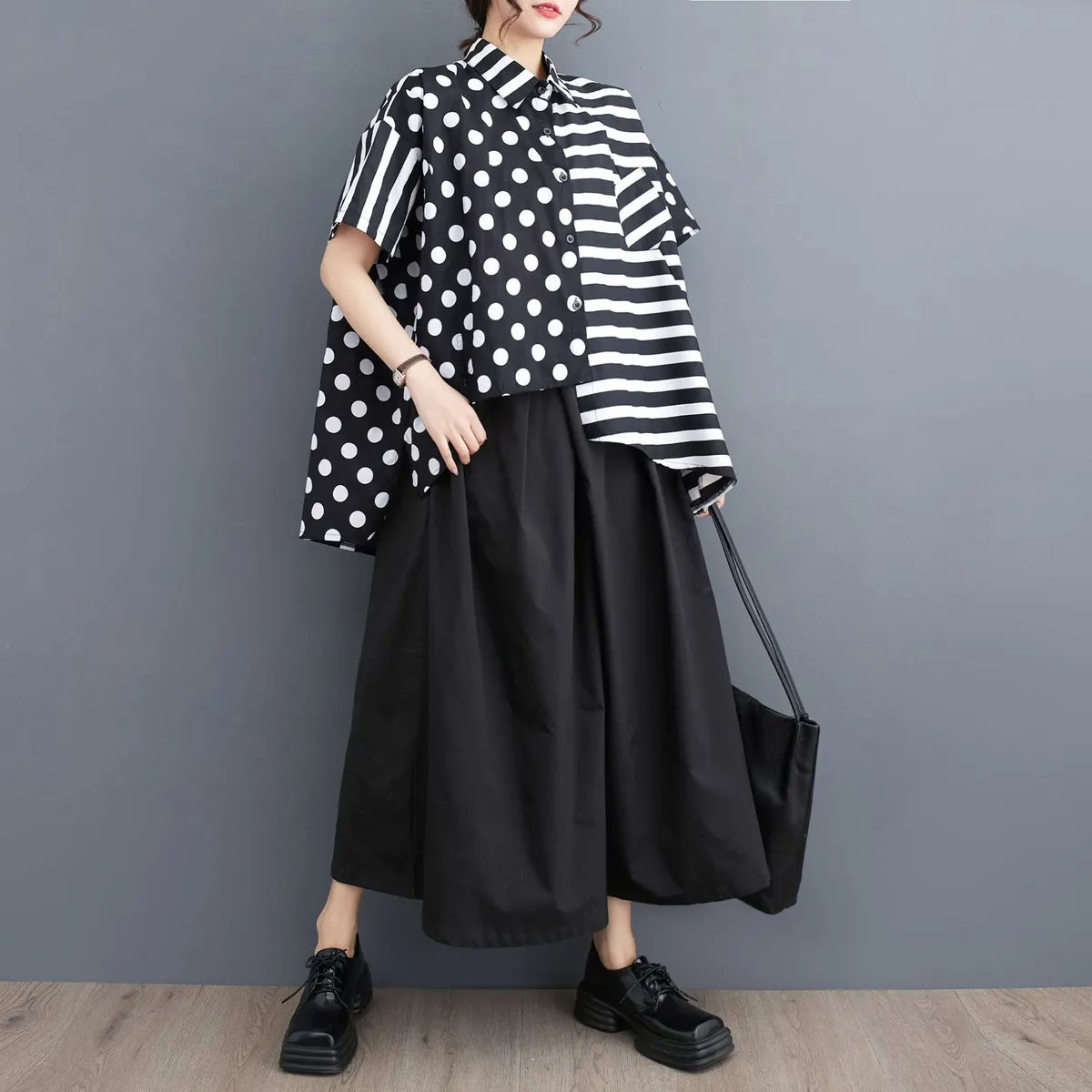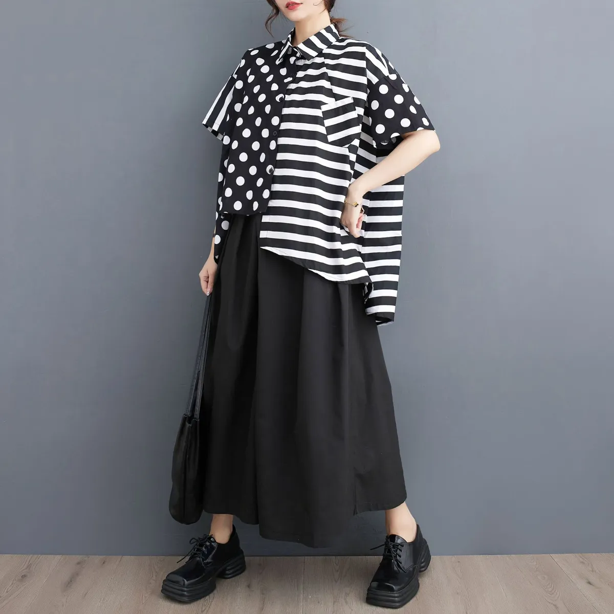 衣都精品- 新款韓版大碼寬鬆波點條紋拼接短袖上衣