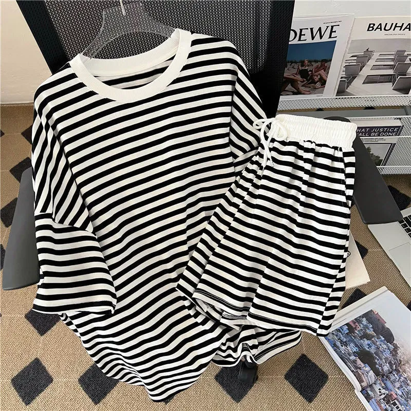 衣都精品- 新款學院風條紋寬鬆時尚短袖上衣+短褲套裝