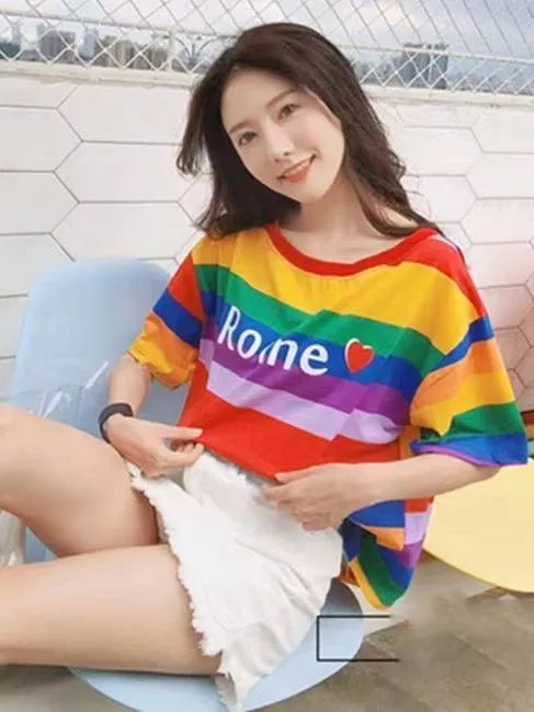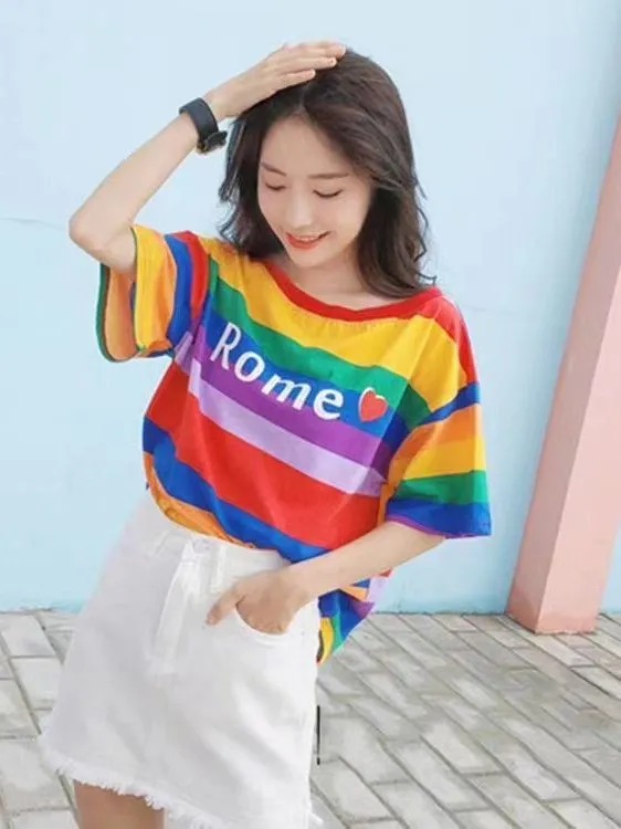 衣都精品- 新款寬鬆大碼學院風短袖彩虹條紋上衣
