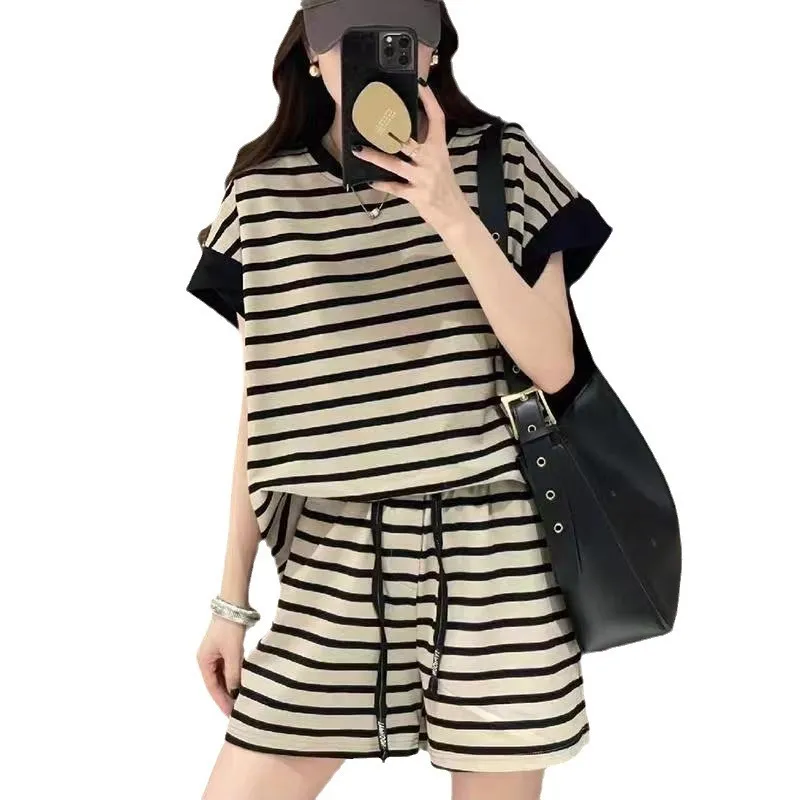 衣都精品- 新款寬鬆休閒條紋短袖上衣+五分褲套裝