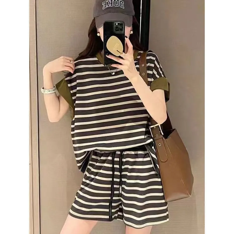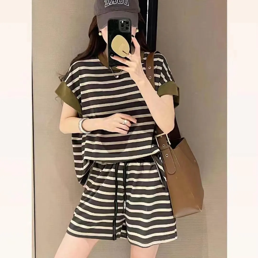 衣都精品- 新款寬鬆休閒條紋短袖上衣+五分褲套裝