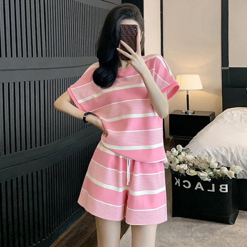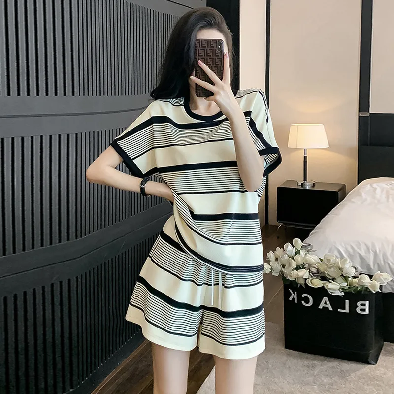 衣都精品- 新款寬鬆休閒條紋短袖上衣+五分褲套裝