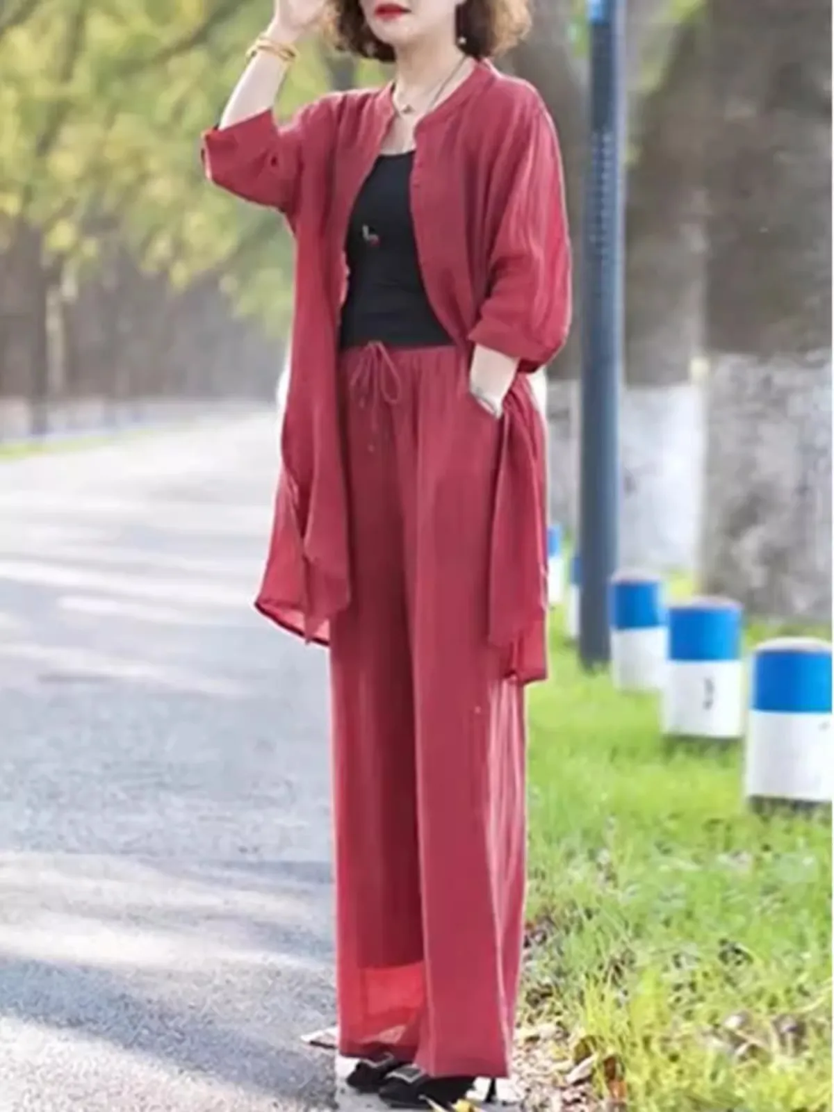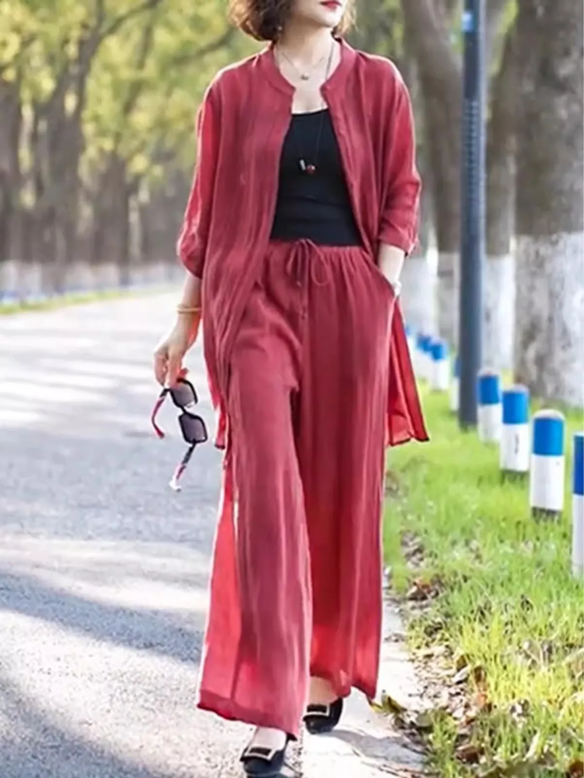 衣都精品- 新款大碼純色七分袖中長襯衫+寬褲套裝