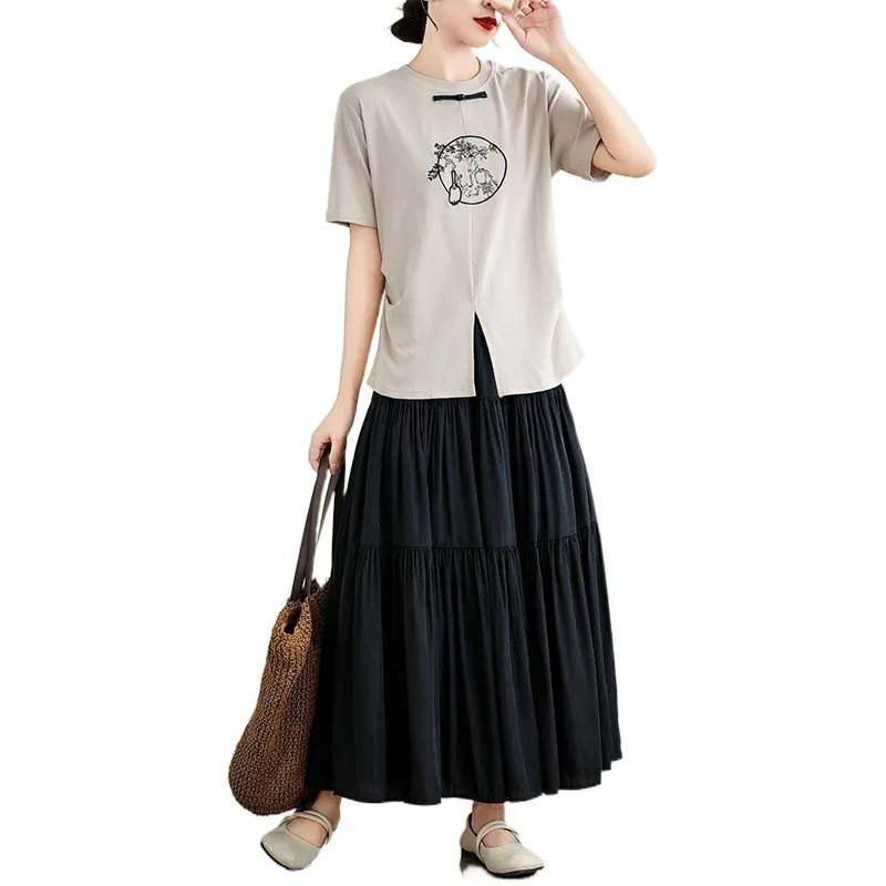 衣都精品- 新款輕薄透氣純色寬鬆圓領中長款上衣