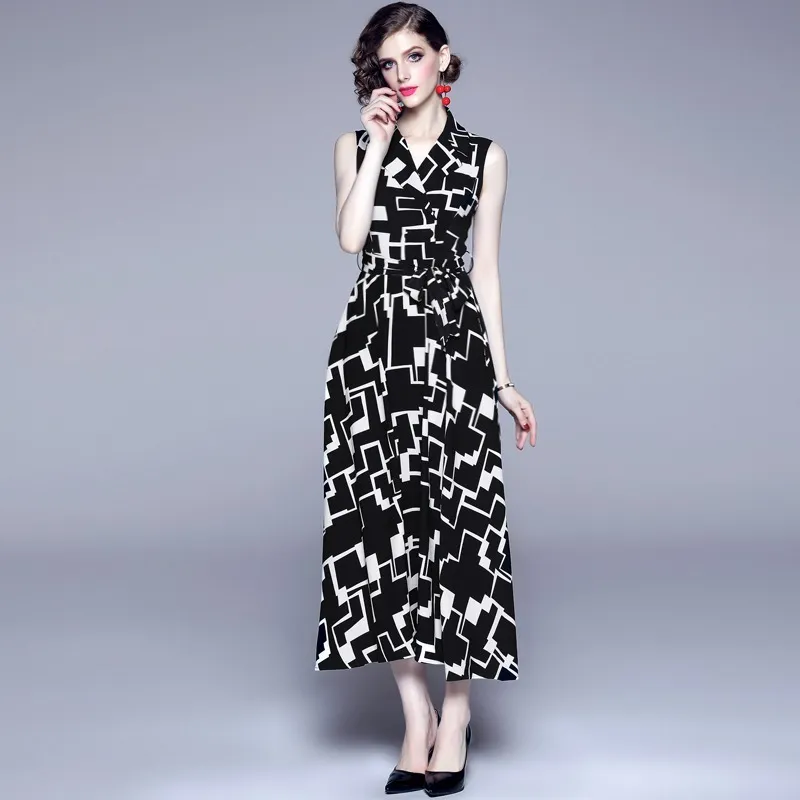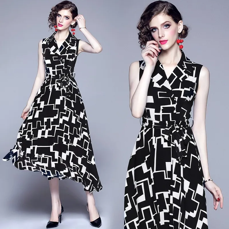 衣都精品- 新款名媛氣質西裝領無袖修身大擺連衣裙