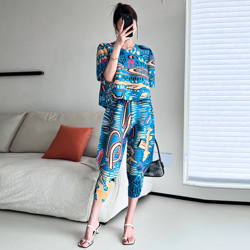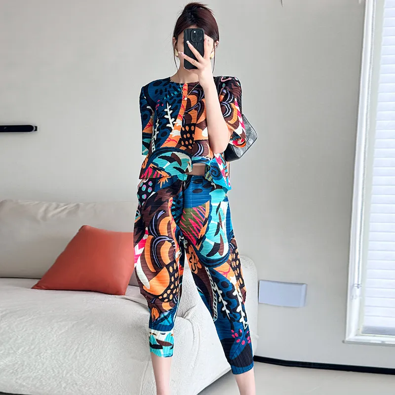 衣都精品- 新款洋氣顯瘦高腰寬鬆印花褶皺燈籠褲