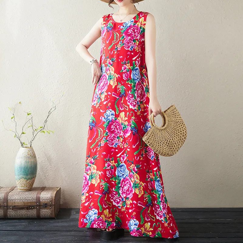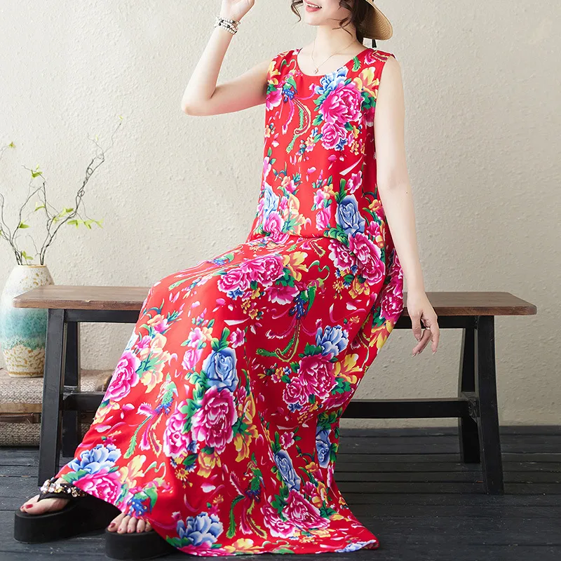 衣都精品- 新款寬鬆東北大花無袖背心裙