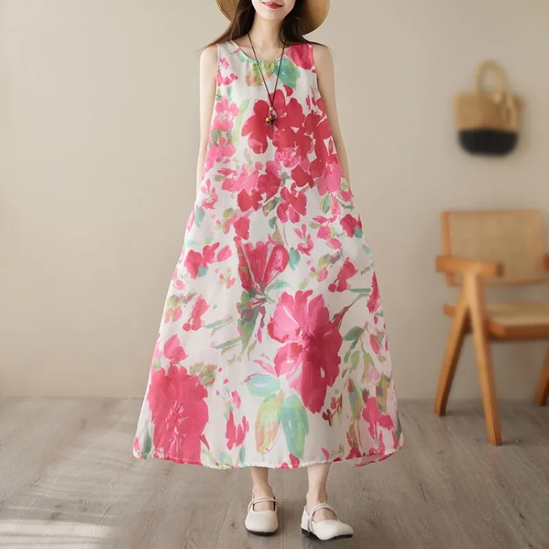 衣都精品- 新款圓領薄款印花寬鬆度假風無袖背心裙