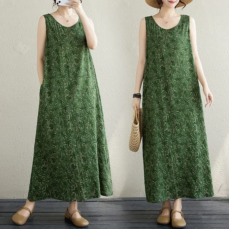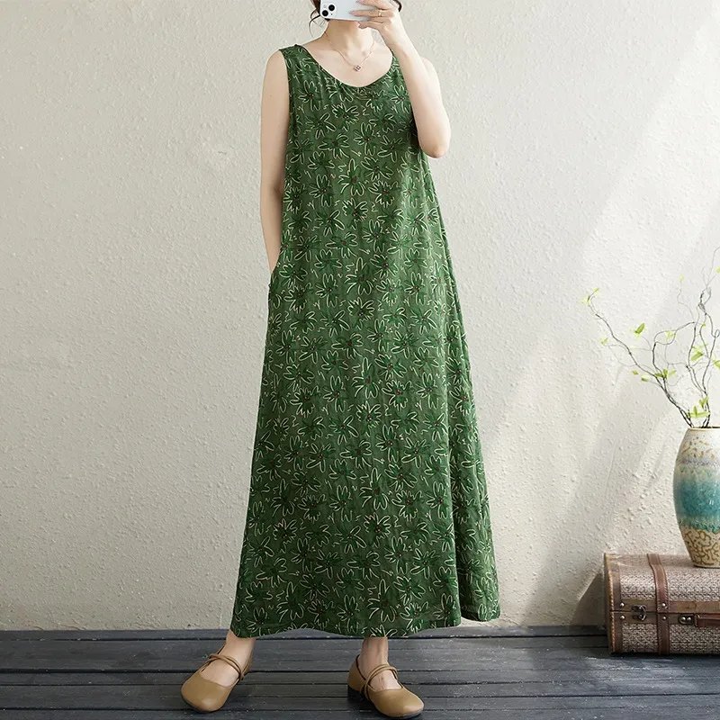 衣都精品- 新款圓領薄款印花寬鬆度假風無袖背心裙
