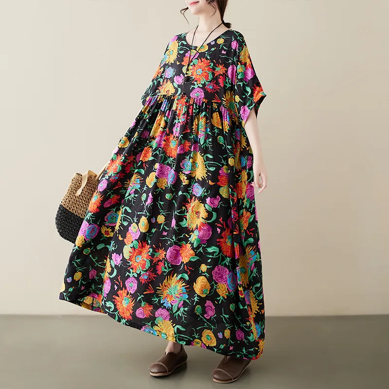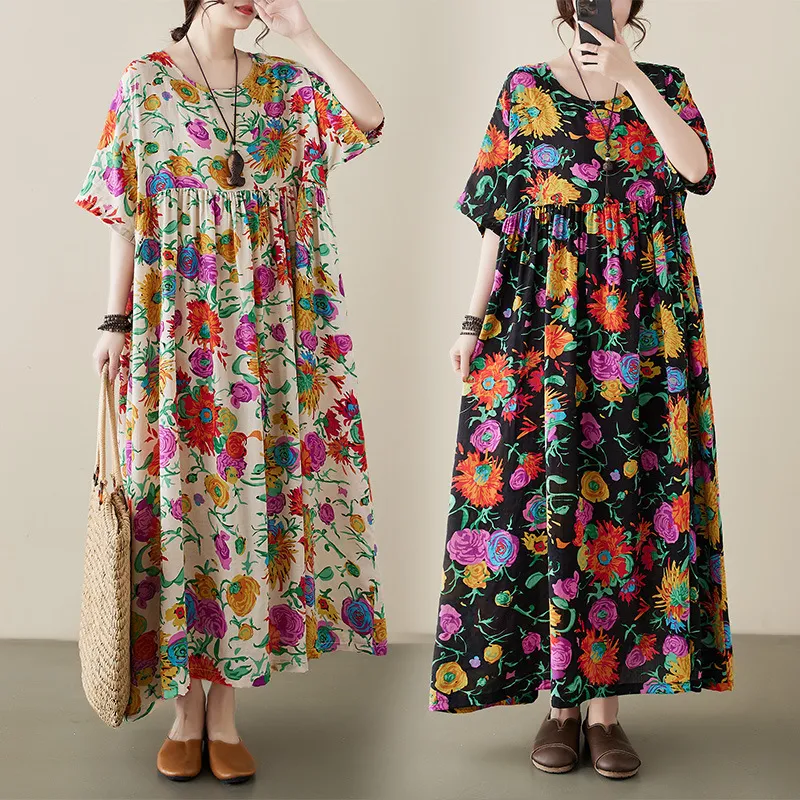 衣都精品- 新款民族風圓領短袖寬鬆顯瘦印花連衣裙