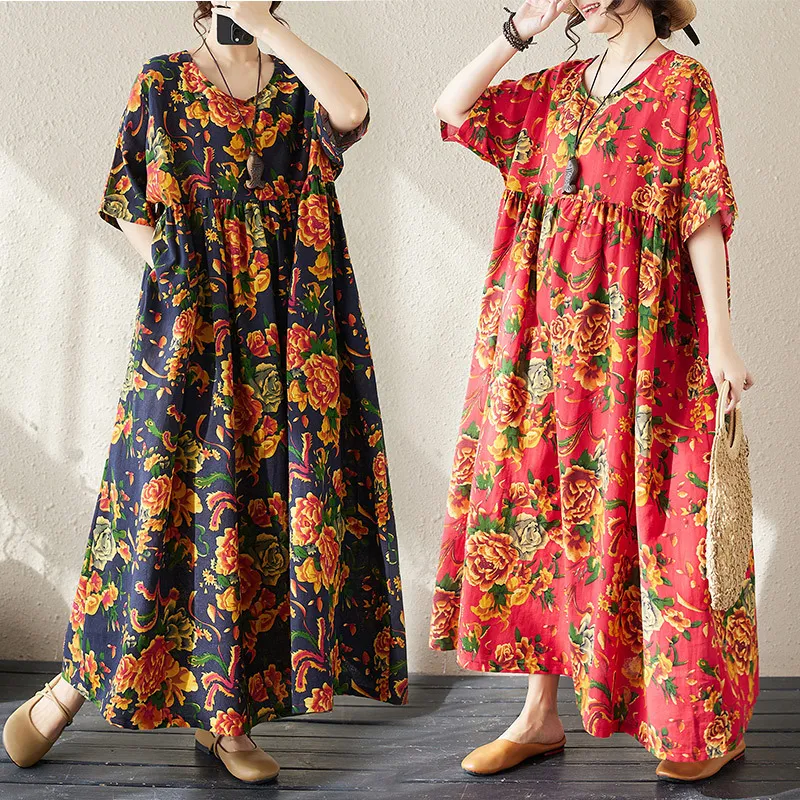 衣都精品- 新款東北大花寬鬆顯瘦短袖大擺連衣裙