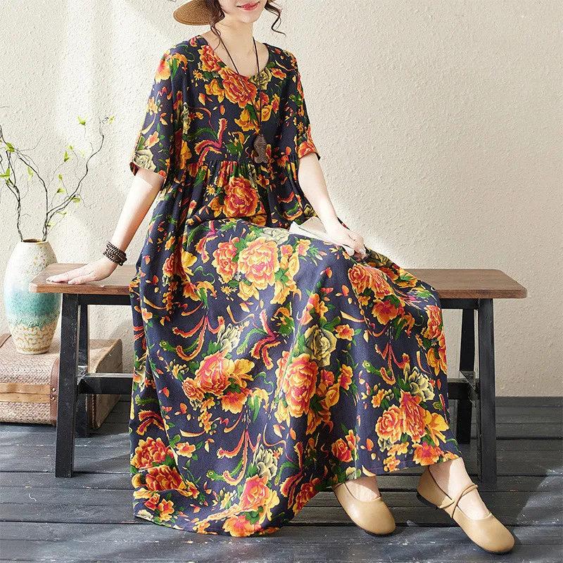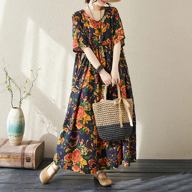 衣都精品- 新款民族風圓領短袖寬鬆顯瘦印花連衣裙