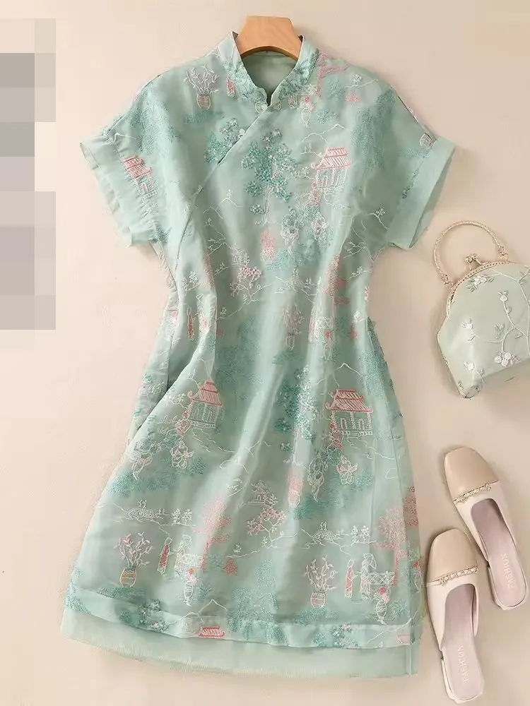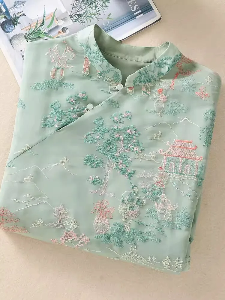 衣都精品- 新款立領斜襟歐根紗重工刺繡中長款旗袍上衣