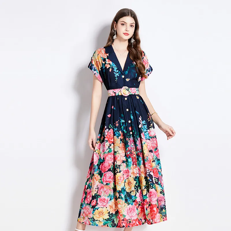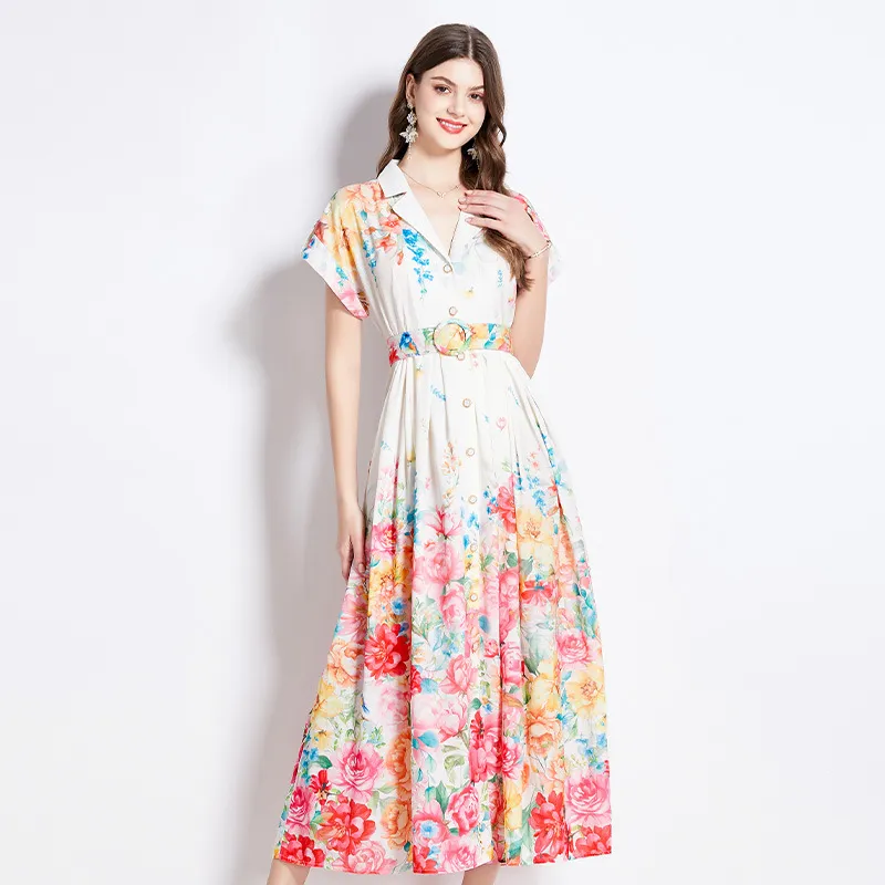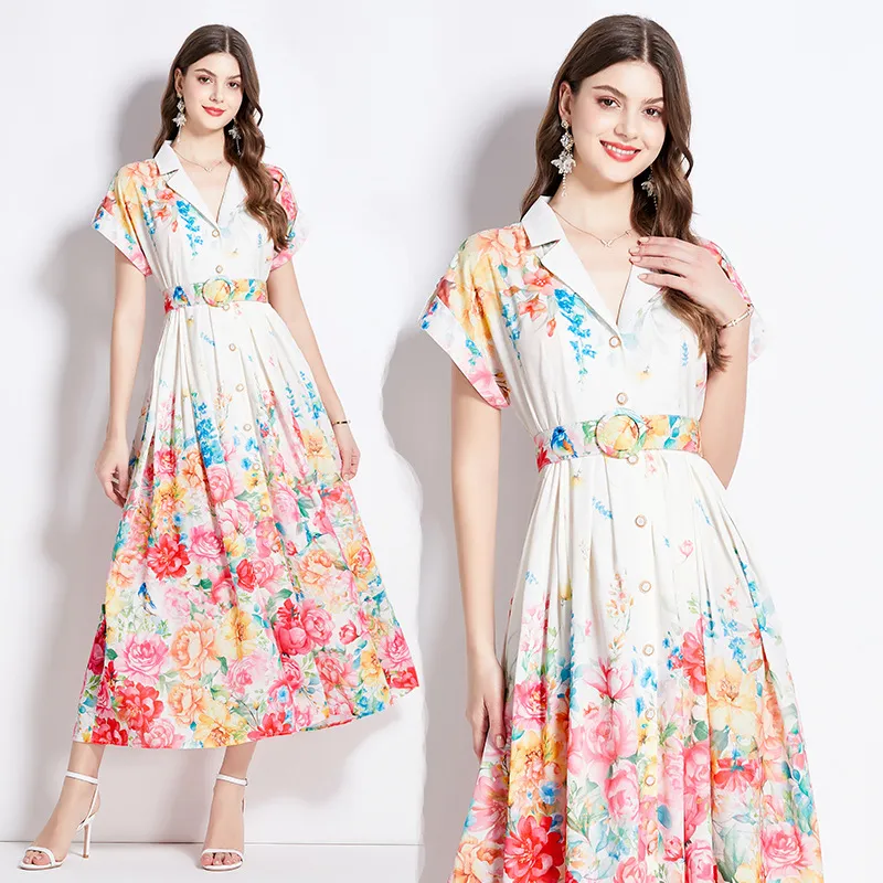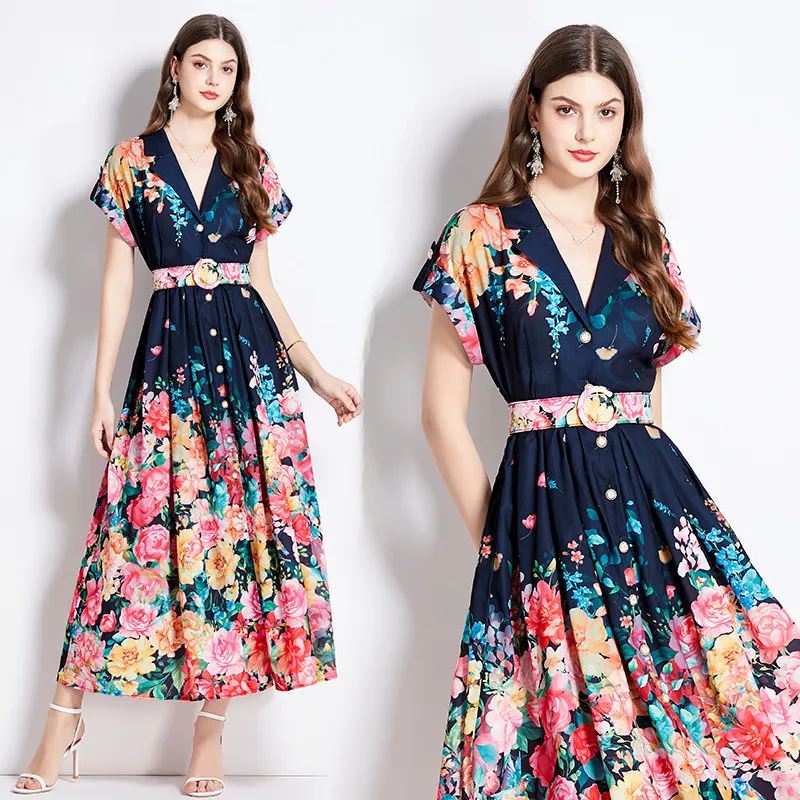 衣都精品- 新款復古印花西裝領短袖顯瘦收腰氣質連衣裙