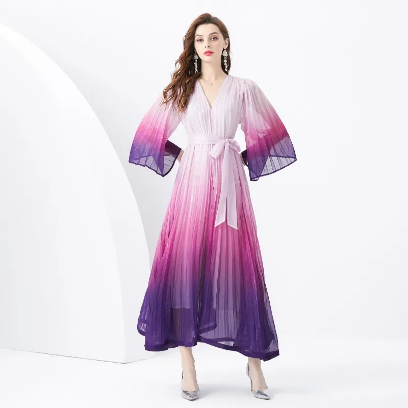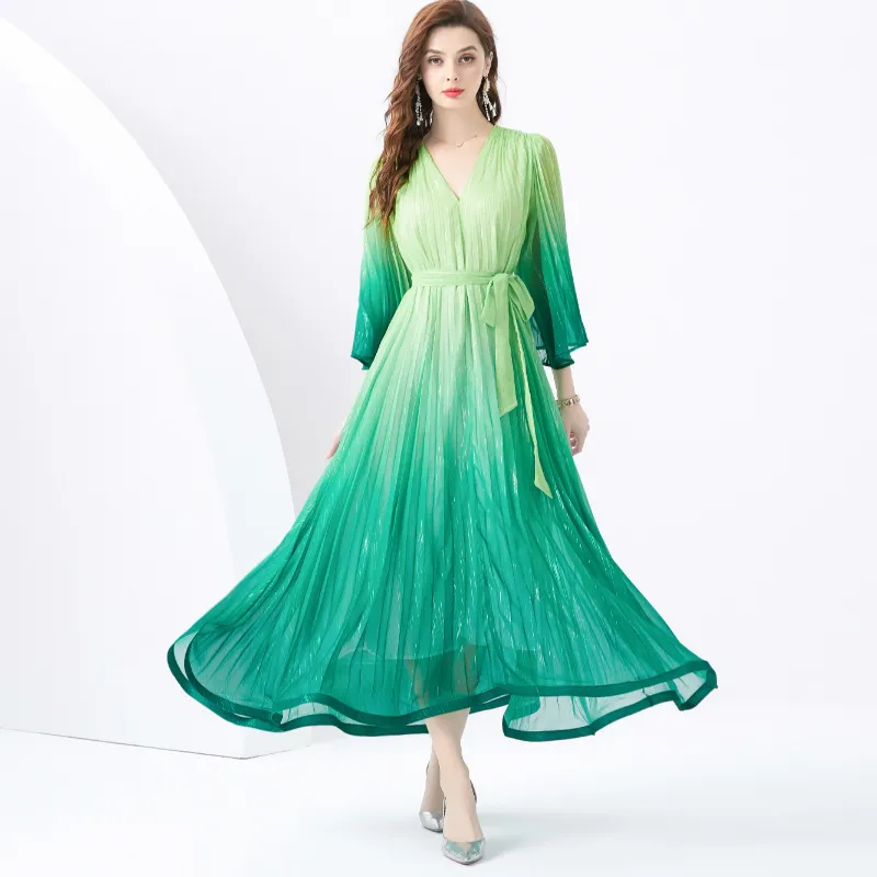 衣都精品- 新款度假風V領喇叭袖百褶波浪連衣裙