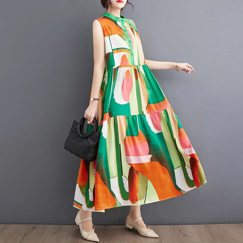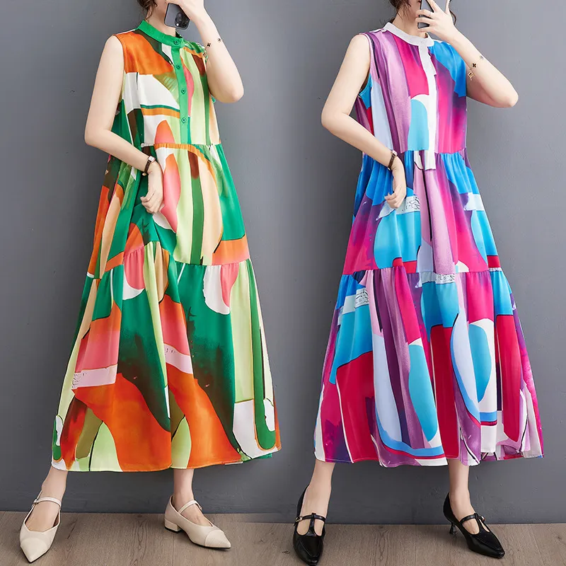 衣都精品- 新款大碼文藝印花顯瘦撞色無袖背心裙